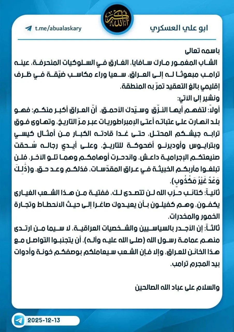 In a statement, Abu Ali Al-Askari, the group’s spokesperson, portrayed Savaya as “an obscure young man immersed in corrupt behaviors,” accusing Trump of sending him to Iraq for “narrow gains” amid a complicated regional landscape.