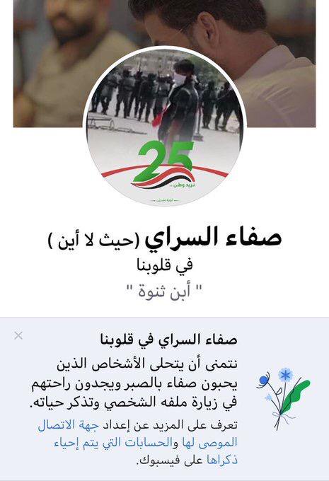 The phrase, "In our hearts” was next to their names with a bar at the top of the page reads “We hope people who love #Hussein_al-Darraji and #Safa_al-Saray will will find comfort in visiting his profile to remember and celebrate his life”.