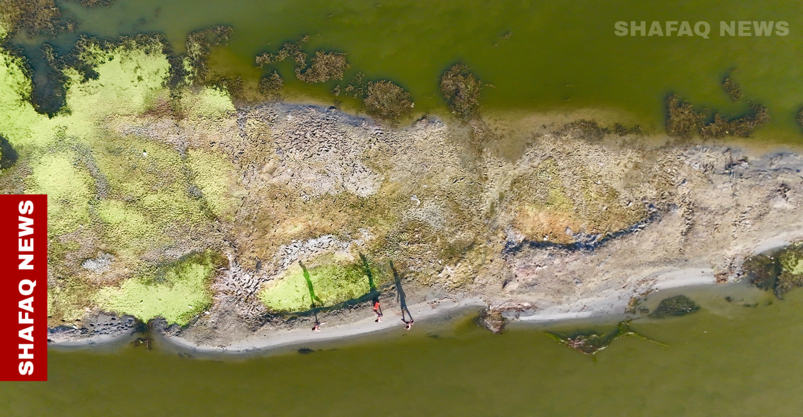 Aerial images obtained by Shafaq News reveal vast stretches of exposed riverbed, the result of a sharp decline in water levels. Local farmers said orchards of figs and date palms have withered, while surviving livestock now face severe water shortages.