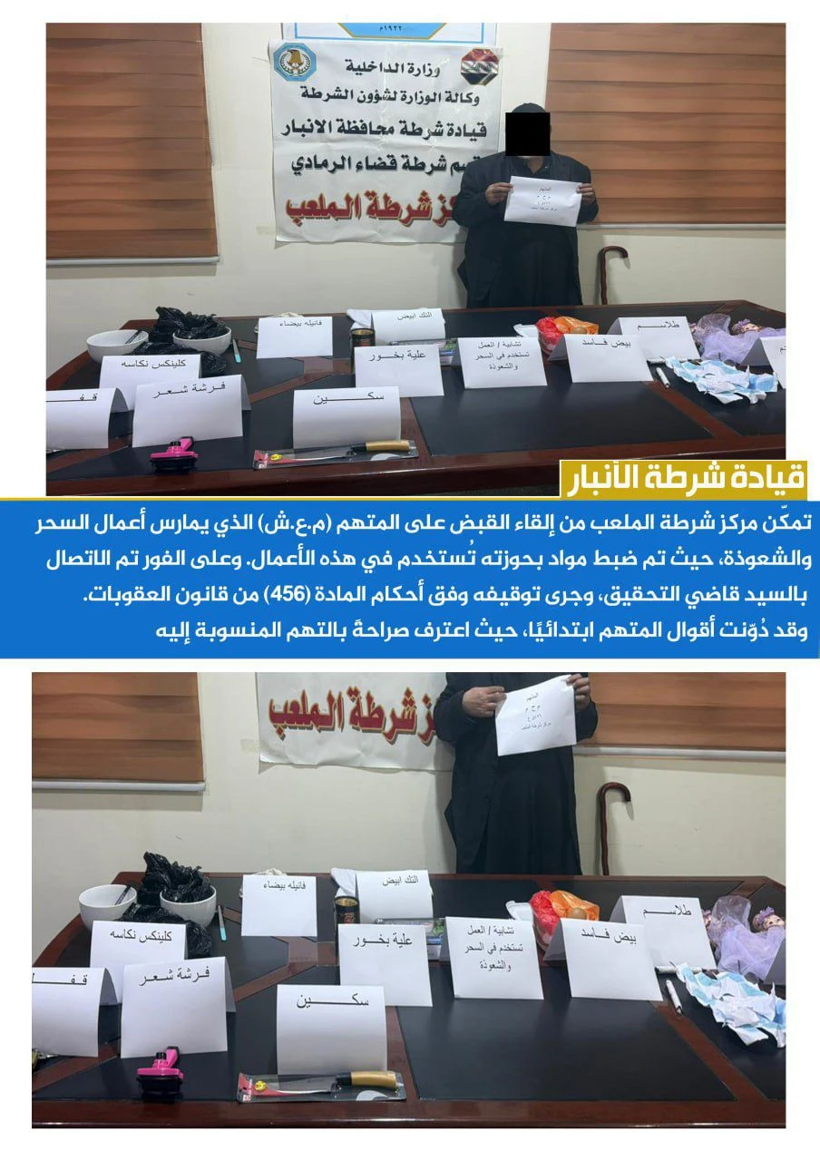 وإلى الأنبار، أعلنت قيادة شرطة المحافظة في بيان ورد لوكالة شفق نيوز، تمكن مركز شرطة الملعب من "إلقاء القبض على المتهم (م. ع. ش) الذي يمارس أعمال السحر والشعوذة، حيث تم ضبط مواد بحوزته تستخدم في هذه الأعمال".