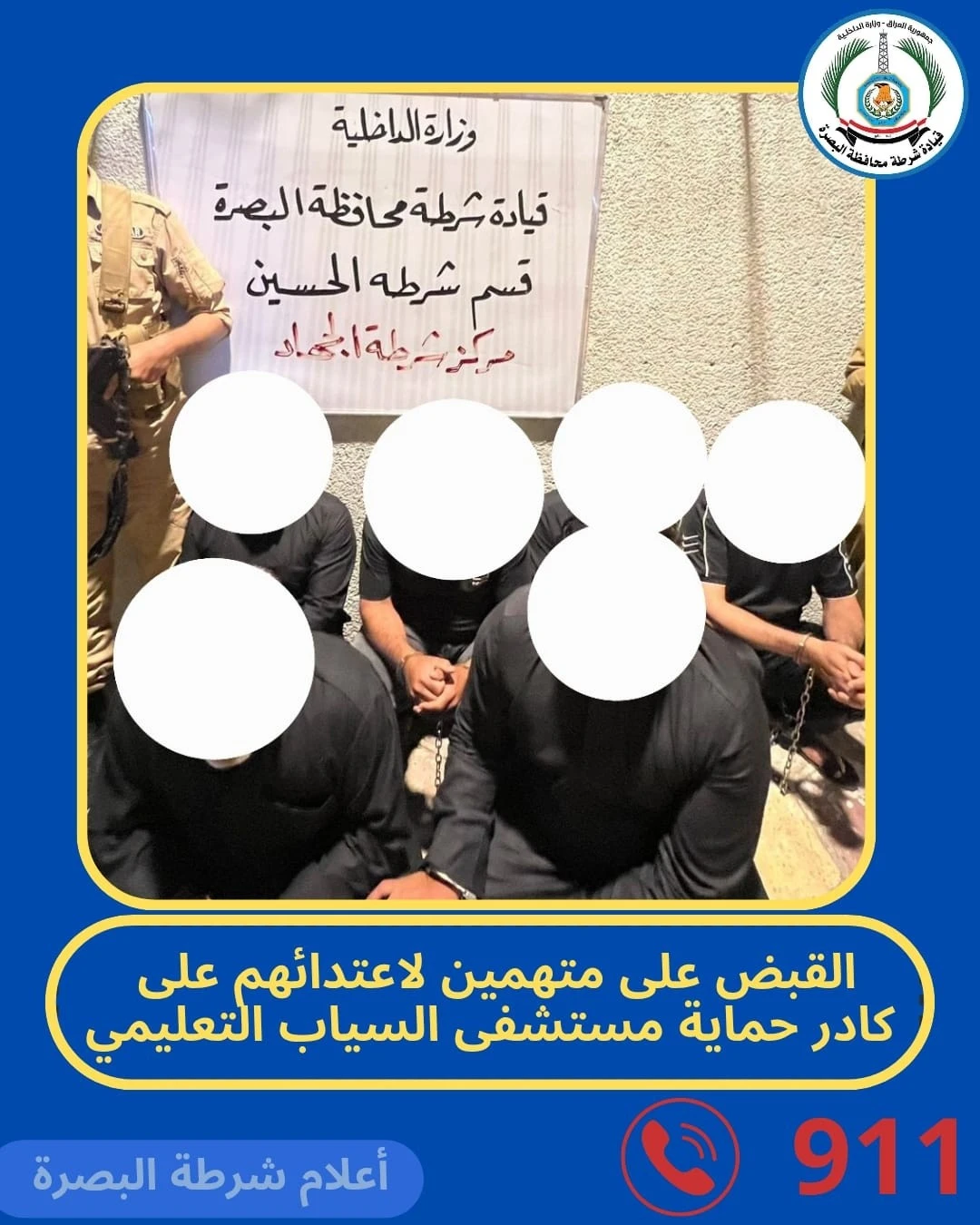 وفي البصرة، قالت قيادة شرطة المحافظة في بيان ورد لوكالة شفق نيوز، إن قوة مشتركة تمكنت من إلقاء القبض على متهمين اعتدوا على كادر حماية مستشفى السياب التعليمي، وذلك فور ورود معلومات من السيطرة المركزية عن الحادث، وقد جرى تنفيذ عملية القبض بوقت قياسي، وتم اتخاذ الإجراءات القانونية بحق المتهمين.