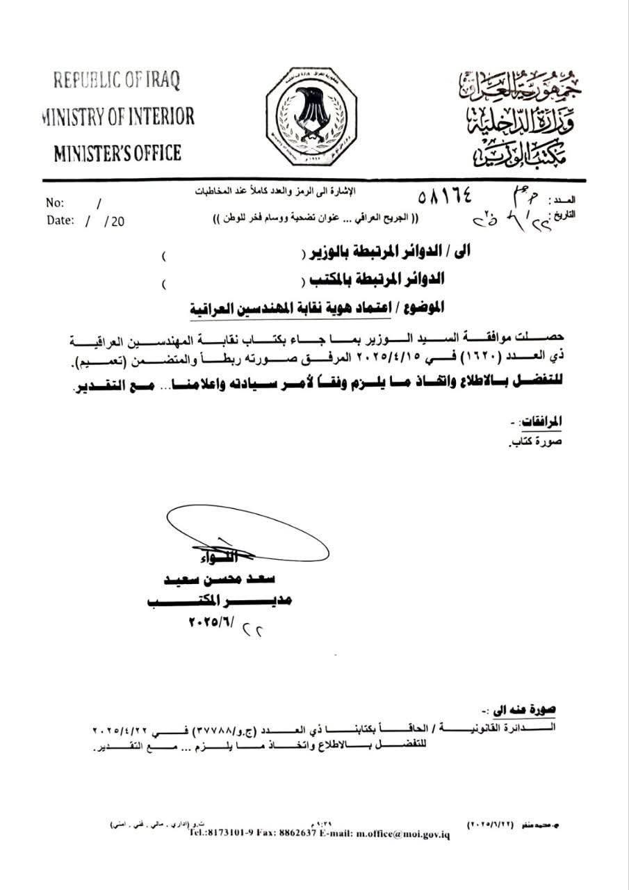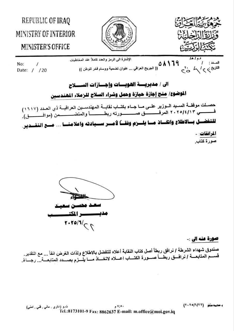 من جانبها، أصدرت وزارة الداخلية بتاريخ 22 حزيران 2025 توجيهًا رسميًا إلى مديرية الهويات وإجازات السلاح تؤكد فيه الموافقة على منح الإجازات المطلوبة، في إطار الإجراءات القانونية والتنظيمية، وبما يعزز الأمن المجتمعي ويدعم دور المهندس العراقي في القطاعين العام والخاص، وذلك وفقا لوثائق صادرة من الوزارة وحصلت عليها الوكالة.