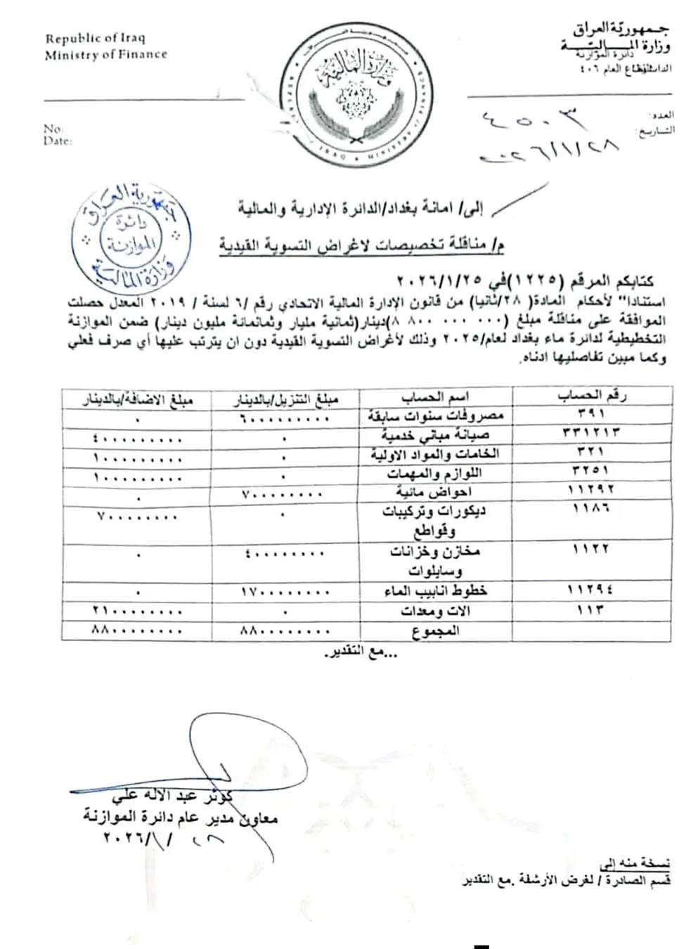 وأشار المصدر في حديث لوكالة شفق نيوز، إلى أن المناقلة شملت جميع الدوائر والوزارات، مستشهداً بكتاب لأمانة بغداد تنشره وكالة شفق نيوز أدناه، بـ"مناقلة 8 مليارات و800 مليون دينار عراقي ضمن الموازنة التخطيطية لدائرة ماء بغداد وذلك لأغراض التسوية النقدية".