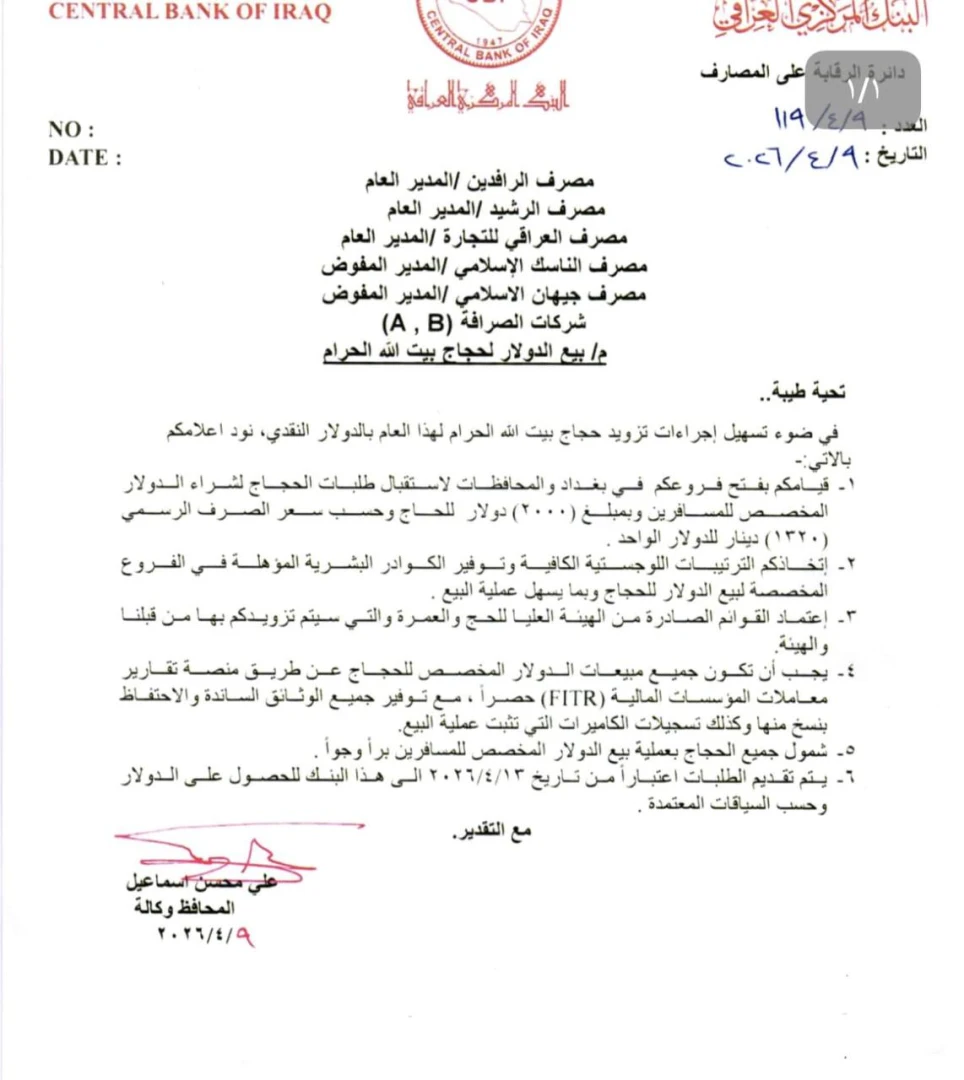 وشدد البنك، في وثيقة رسمية، حصلت عليها وكالة شفق نيوز، على ضرورة اتخاذ الإجراءات اللوجستية اللازمة كافة، بما في ذلك توفير الكوادر المؤهلة لضمان انسيابية عملية بيع الدولار للحجاج وتسهيلها.
