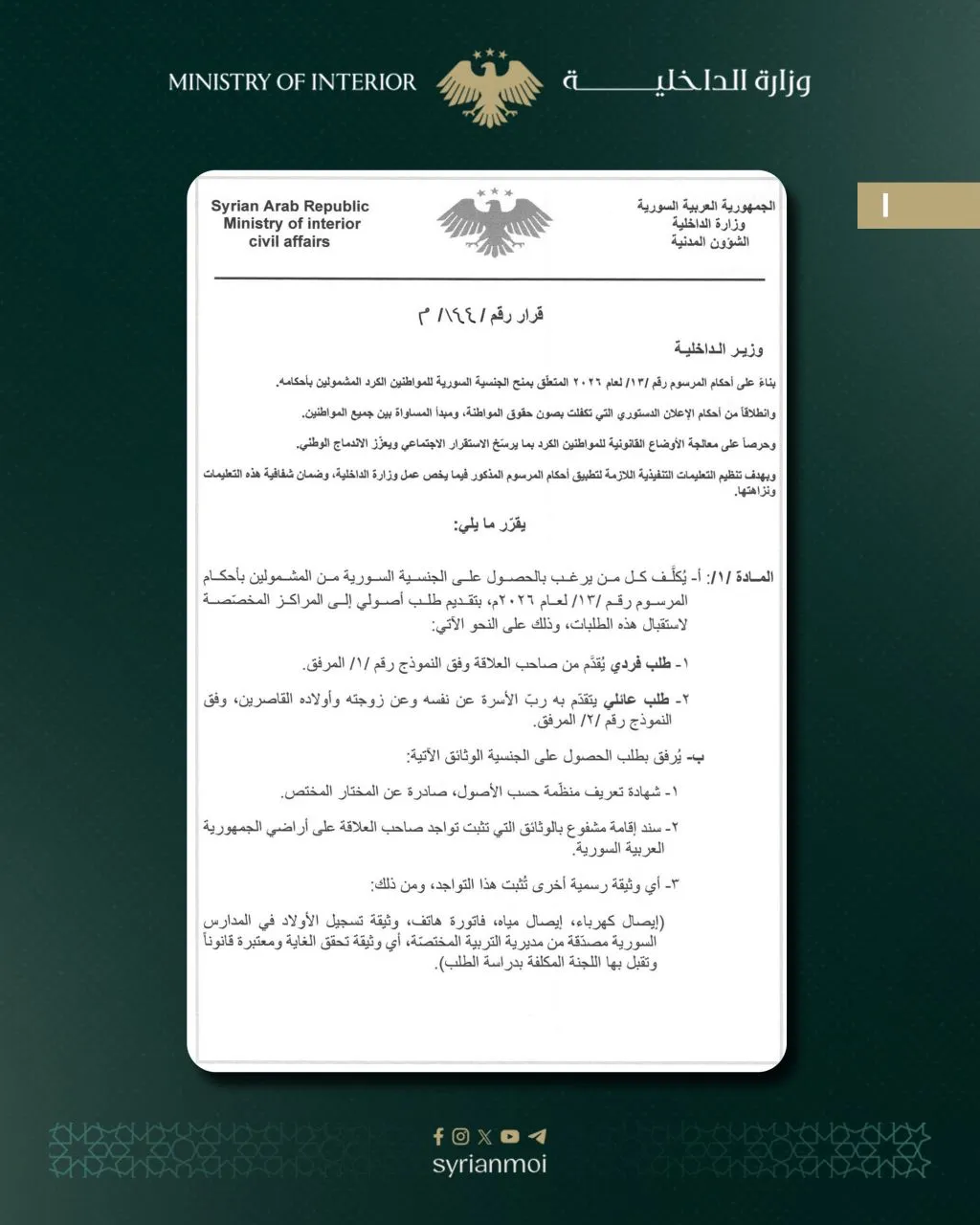 أصدرت وزارة الداخلية السورية، اليوم الجمعة، التعليمات التنفيذية الخاصة بآلية تقديم طلبات الحصول على الجنسية السورية للمواطنين الكورد المشمولين بأحكام المرسوم التشريعي رقم /13/ لعام 2026، وذلك استناداً إلى الإعلان الدستوري ومبدأ المساواة بين المواطنين، بهدف تنظيم استقبال الطلبات ودراستها والبت فيها.