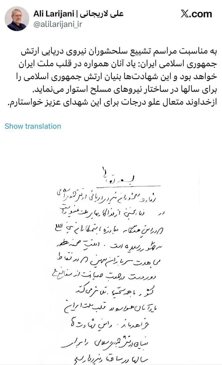 وفي تطور متزامن، نشر حساب يُنسب إلى لاريجاني على منصة "إكس" رسالة بخط يده دون تحديد تاريخها، نعى فيها قتلى البحرية الإيرانية.