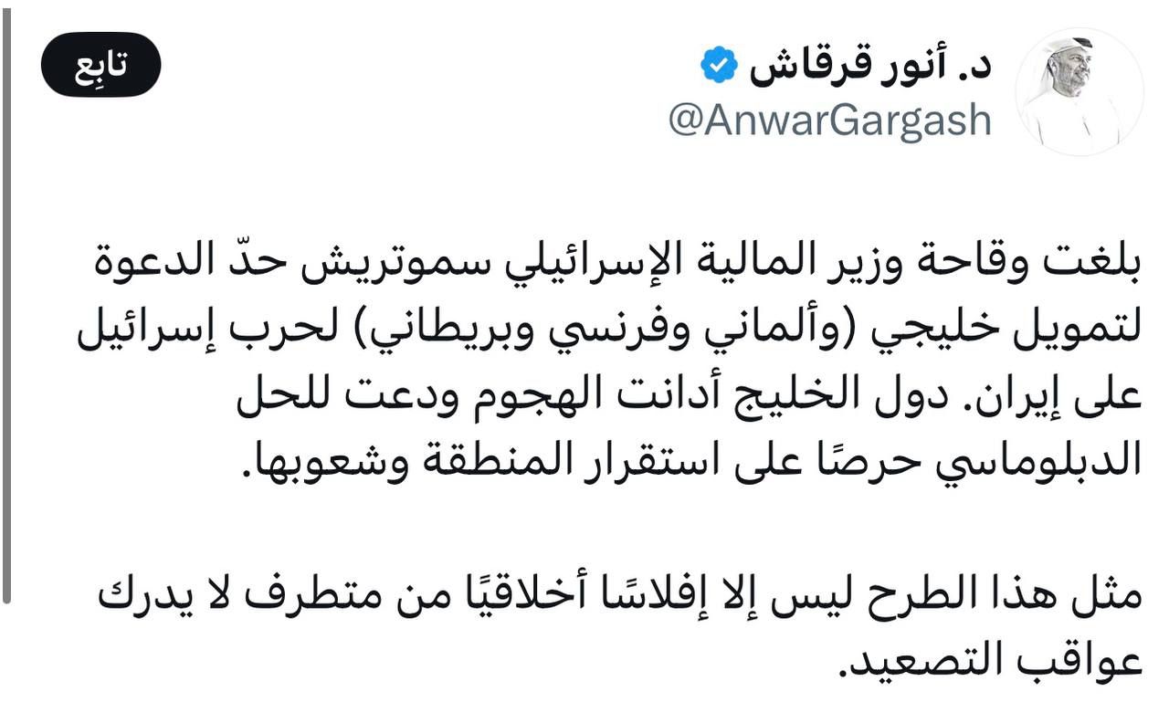 مستشار بن زايد: إسرائيل طلبت تمويلاً خليجياً وأوروبياً لحربها ضد إيران
