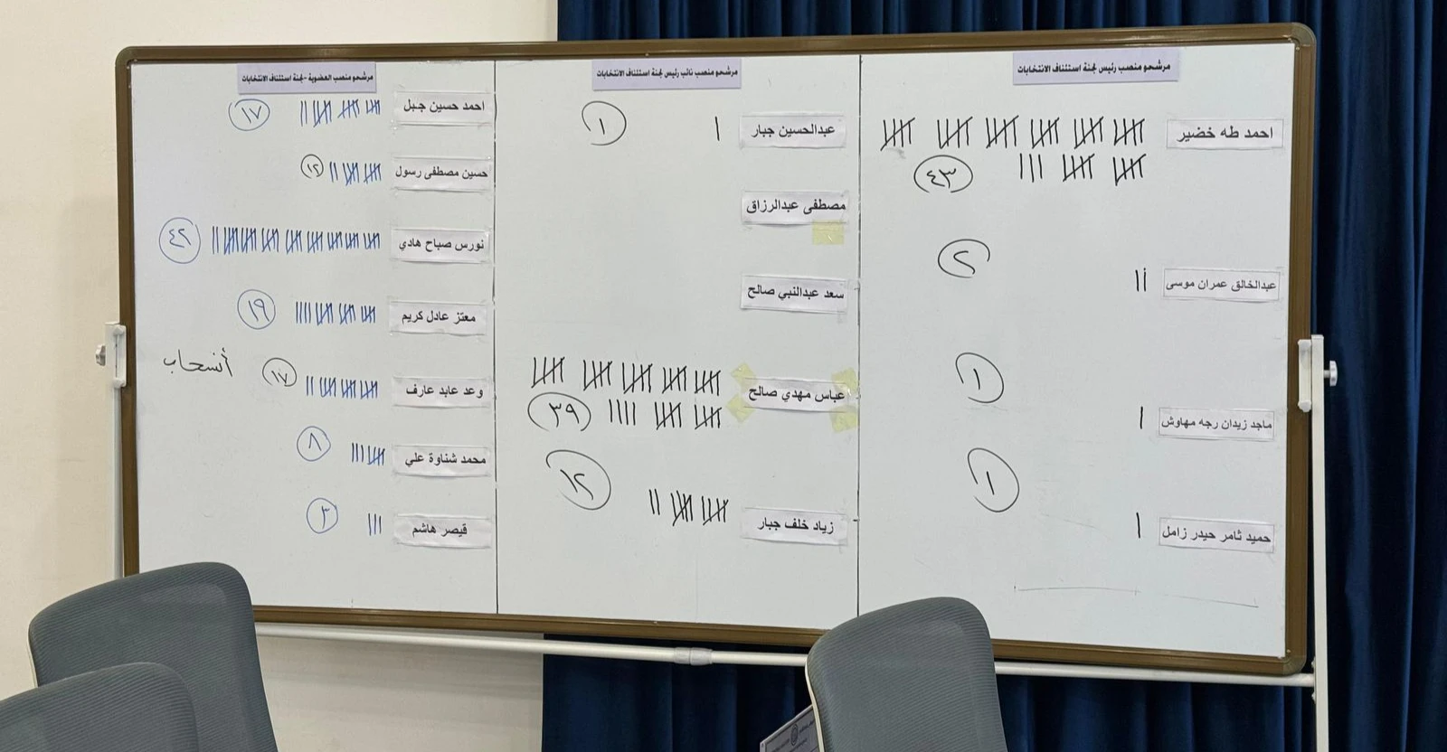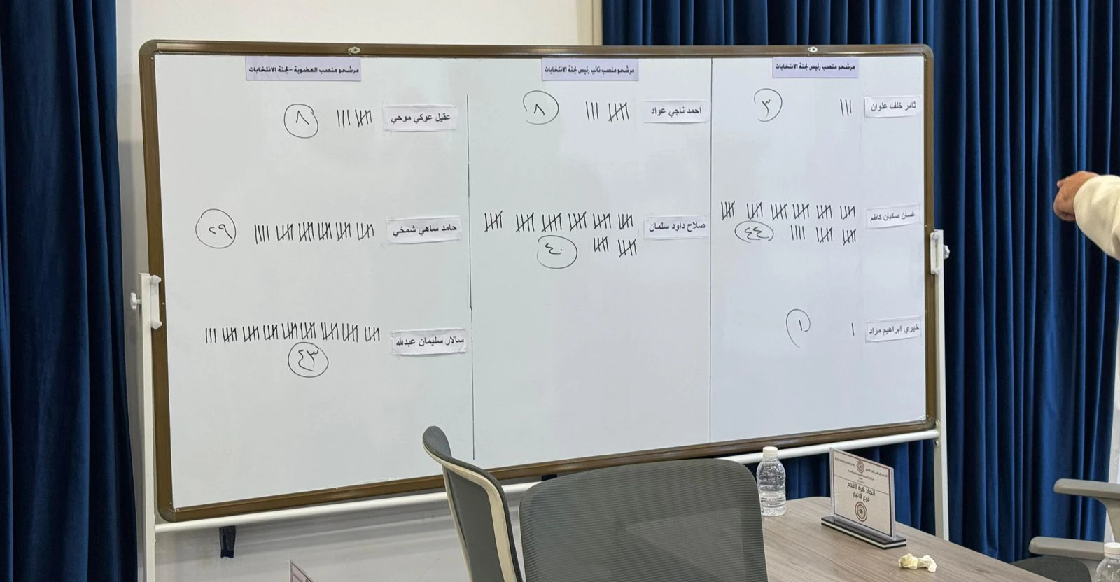 وعقدت الهيئة العامة للاتحاد اجتماعها الاستثنائي لإجراء عملية الانتخاب، واسفرت نتائج التصويت عن انتخاب غسان صكبان التميمي رئيساً للجنة الانتخابات بعد حصوله على 44 صوتاً، فيما جاء صلاح داوود نائباً للرئيس بـ40 صوتاً، وسالار سليمان عضواً بـ43 صوتاً.