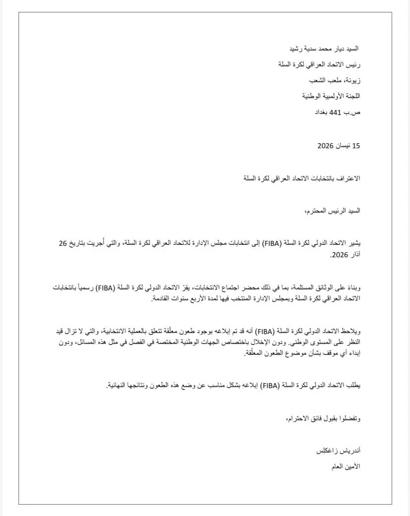 أعلن الاتحاد الدولي لكرة السلة (FIBA)، يوم الأربعاء، عن مصادقته رسمياً على شرعية انتخابات الهيئة الادارية للاتحاد العراقي لكرة السلة، التي أقيمت مؤخراً في العاصمة بغداد.