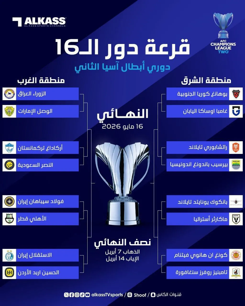 وتُختتم البطولة بإقامة المباراة النهائية من مواجهة واحدة بين بطلي الغرب والشرق، يوم 16 أيار/مايو 2026 .