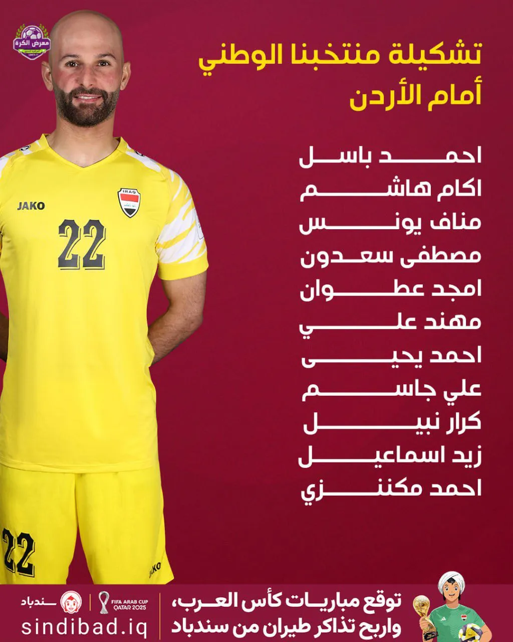 أعلن مدرب المنتخب العراقي لكرة القدم، غراهام أرنولد، يوم الجمعة، عن تشكيلة المنتخب لمواجهة نظيره الأردني ضمن منافسات دور الربع النهائي لبطولة كأس العرب في قطر.