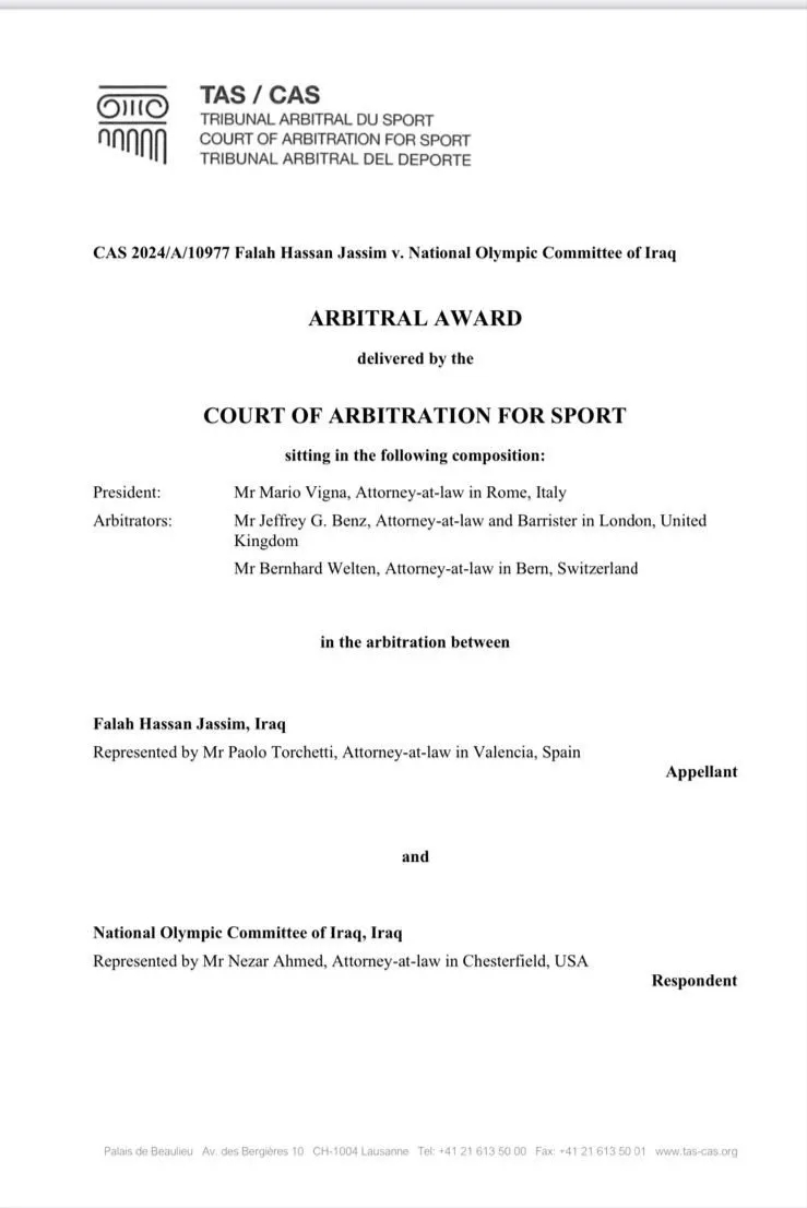 أصدرت محكمة التحكيم الرياضي الدولية (كاس)، يوم الثلاثاء، قرارها بردّ الاستئناف المقدم من فلاح حسن ضد قرار اللجنة الأولمبية العراقية القاضي بحلّ الهيئة الإدارية التي كان يرأسها، وأيّدت المحكمة قرار مركز التسوية والتحكيم الرياضي العراقي.