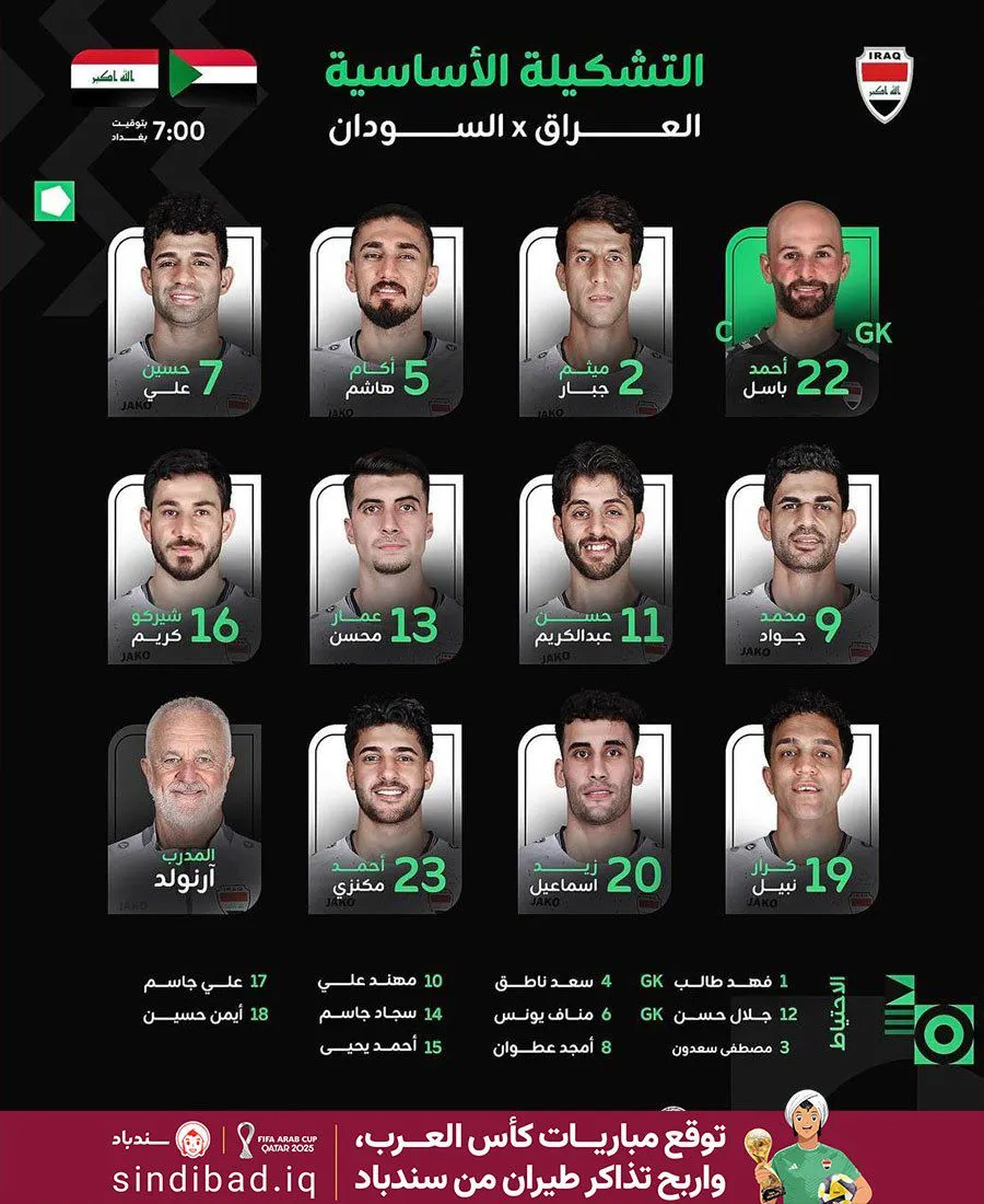 أعلن مدرب المنتخب العراقي غراهام أرنولد، مساء اليوم السبت، تشكيلة "أسود الرافدين" لمواجهة نظيره السوداني ضمن منافسات الجولة الثانية لبطولة كأس العرب الجارية في قطر.