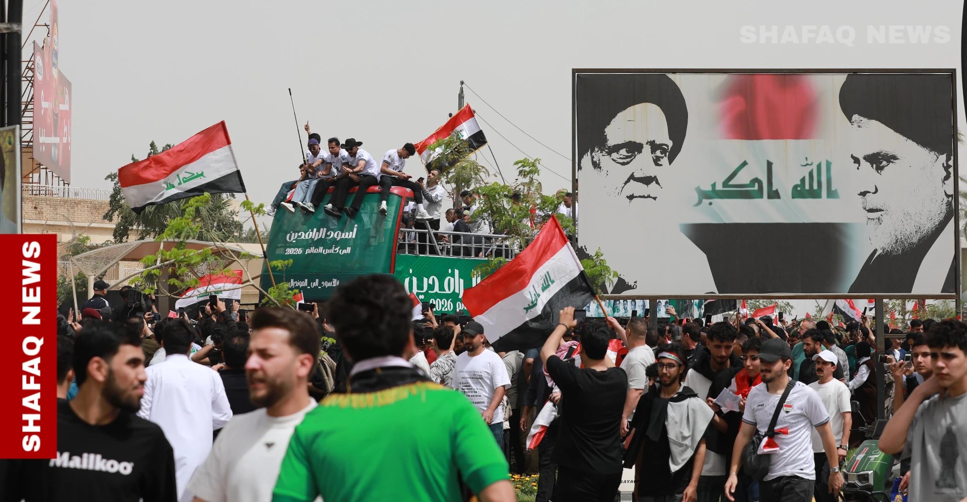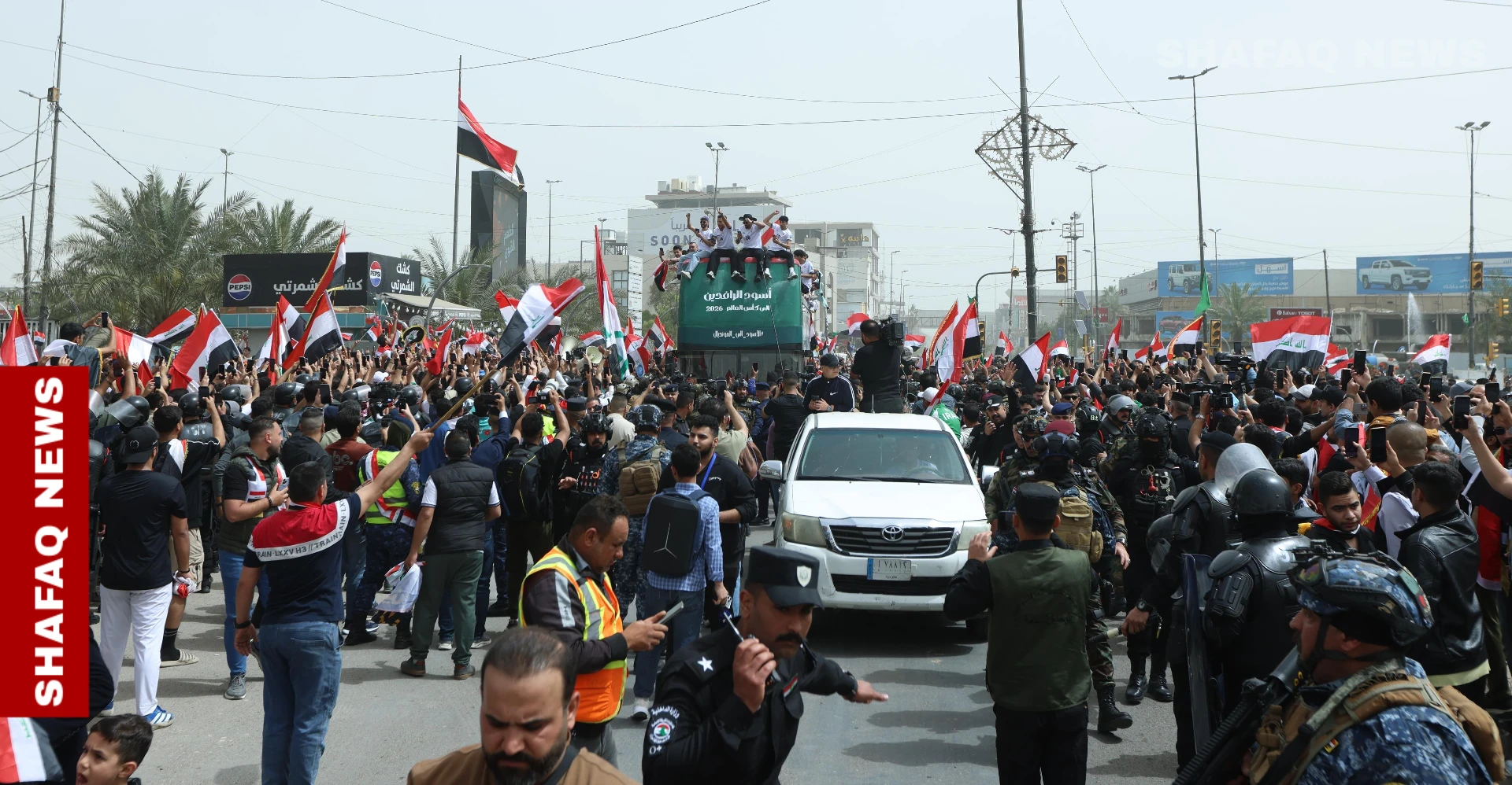وانطلقت الحافلة المكشوفة وسط حضور جماهيري كبير، حيث احتشد الآلاف من المشجعين في الشوارع والساحات للتعبير عن فرحتهم بهذا الانجاز التاريخي، رافعين الأعلام العراقية ومرددين الهتافات الداعمة للمنتخب الوطني.