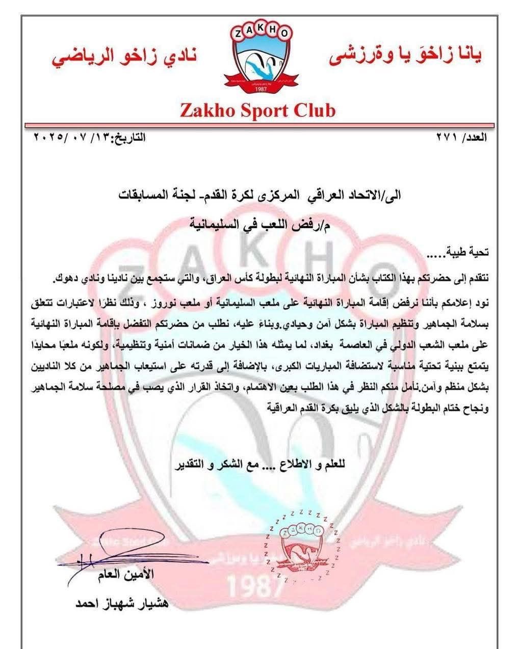 قدمت إدارة نادي زاخو، يوم الاثنين، كتاباً رسمياً إلى اتحاد العراقي لكرة القدم أكدت فيه رفض اللعب على ملعب السليمانية أو ملعب نوروز.