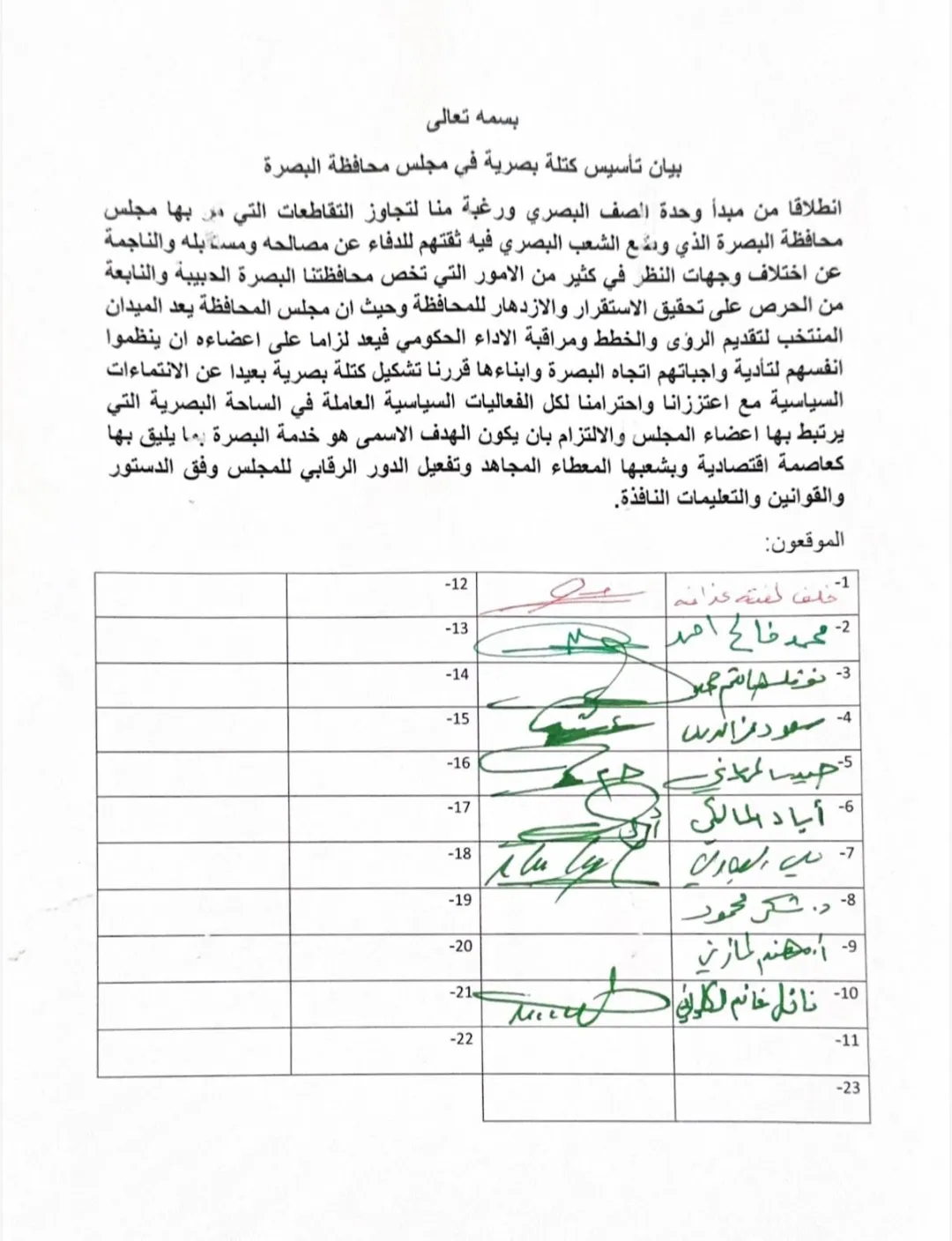 البصرة.. 13 عضواً يشكّلون كتلة جديدة داخل مجلس المحافظة (وثيقة)