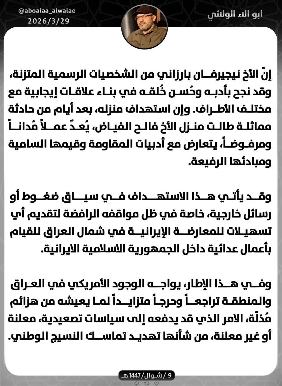 أبو آلاء الولائي: استهداف منزل نيجيرفان بارزاني عمل مدان يتعارض مع أدبيات المقاومة