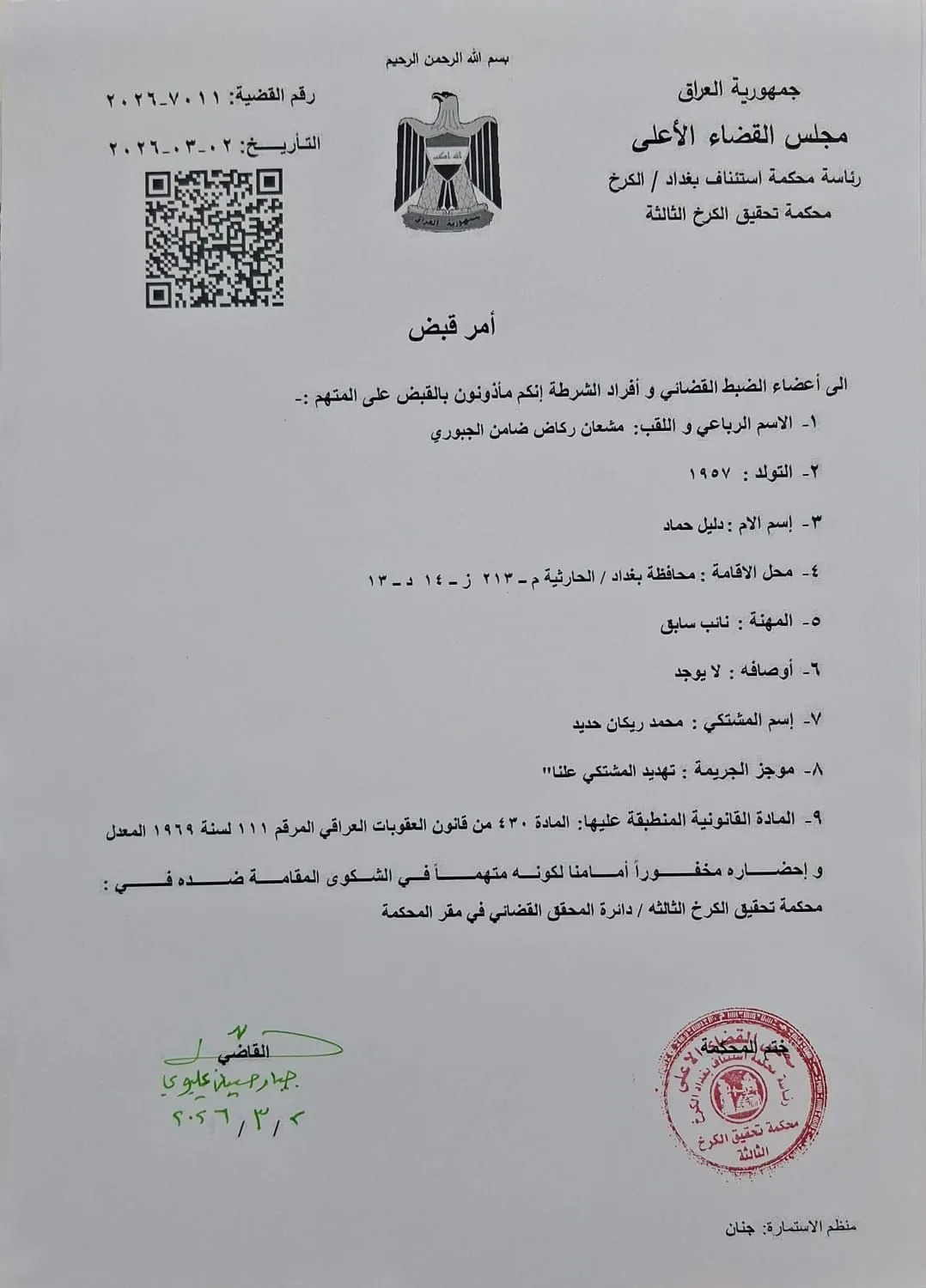 وأشارت وثيقة صادرة بتاريخ 2 آذار/مارس الجاري، وحصلت عليها وكالة شفق نيوز، إلى أن "رئاسة محكمة استئناف بغداد – الكرخ / محكمة تحقيق الكرخ الثالثة، وجّهت أعضاء الضبط القضائي وأفراد الشرطة بالقبض الجبوري، ومحل إقامته في بغداد، بتهمة تهديد المشتكي علناً".