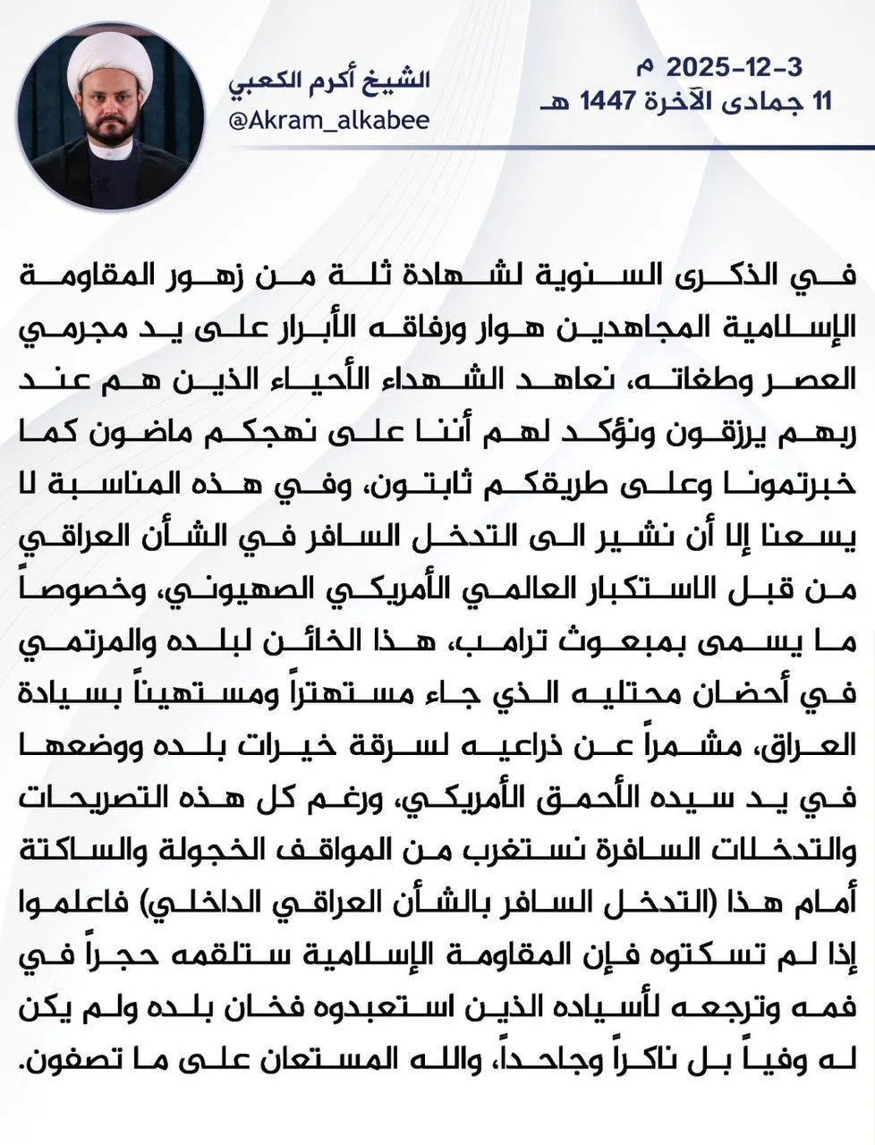 الأمين العام لحركة النجباء، أكرم الكعبي، مساء اليوم الأربعاء، المبعوث الخاص