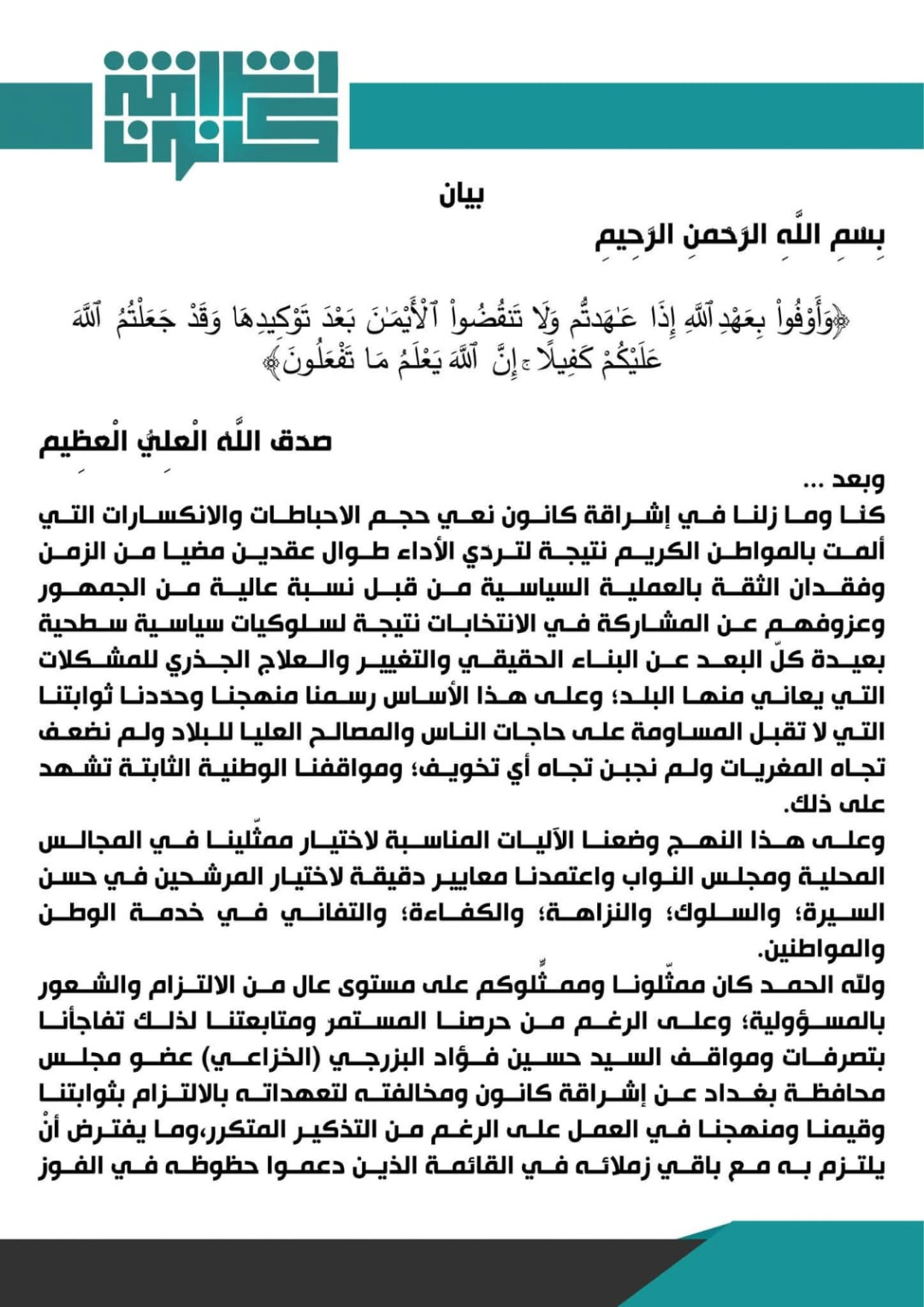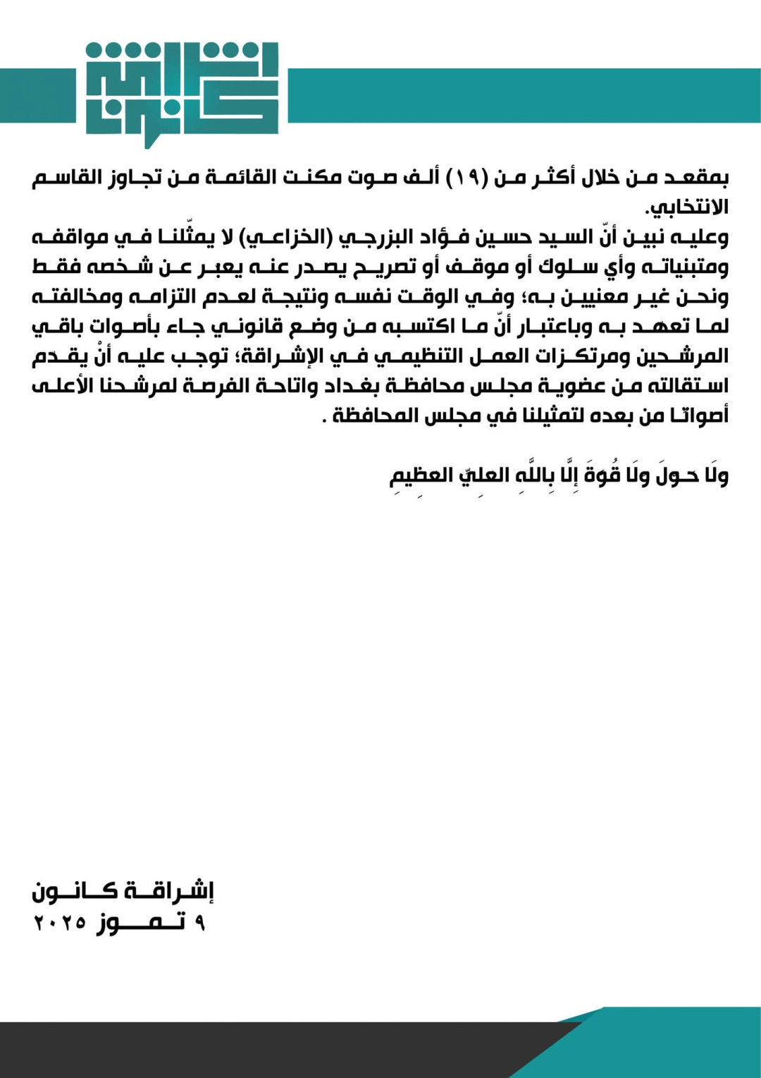 "إشراقة كانون" تتبرأ من ممثلها الوحيد في مجلس محافظة بغداد
