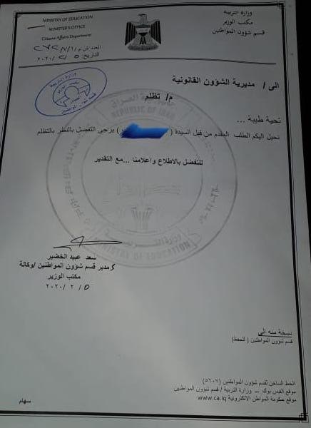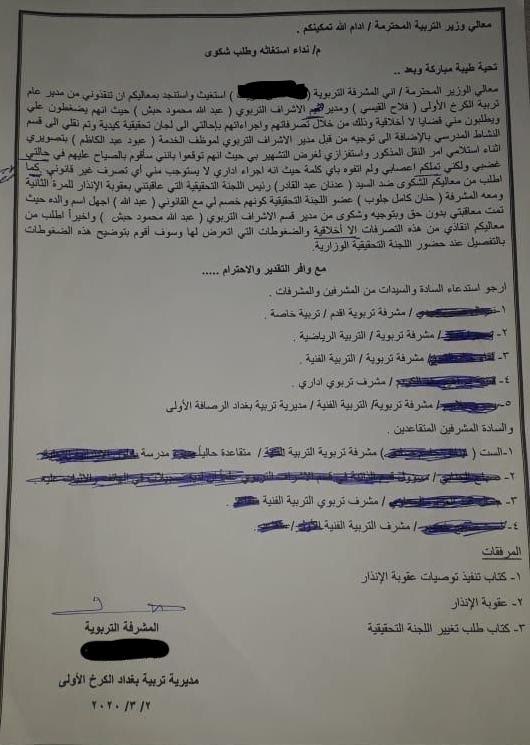 وقالت في بيان "بتاريخ 2017/1/13 نشرنا بياناً طالبنا فيه بردع أشخاص في وزارة التربية يساومون النساء على شرفهن، ومن بين المتحرشين شخص يشغل درجة خاصة ويستقوي بجهات سياسية، ومنذ ذلك الحين (أي منذ ثلاث سنوات) ولغاية اليوم لم يتم اتخاذ إجراء لوضع حد لسلوكياته المنحطة واستهتاره ومحاولاته الرخيصة للاعتداء على أعراض الناس، وبما أنه لم يجد من يردعه تمادى في انحرافه وكثرت الشكاوى ضده، وآخرها شكوى من مشرفة تربوية انتقم منها وأصدر أمراً بنقلها لأنها رفضت التفريط بشرفها".