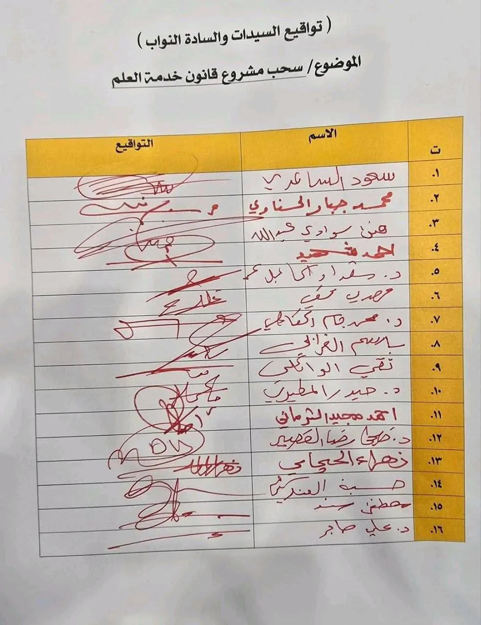 وأشار الموقعون، وفق الوثائق، إلى أن المقترح يحتاج إلى مزيد من الدراسة والإنضاج، لكونه يمس شريحة واسعة من المواطنين وله انعكاسات مباشرة على مؤسسات الدولة.