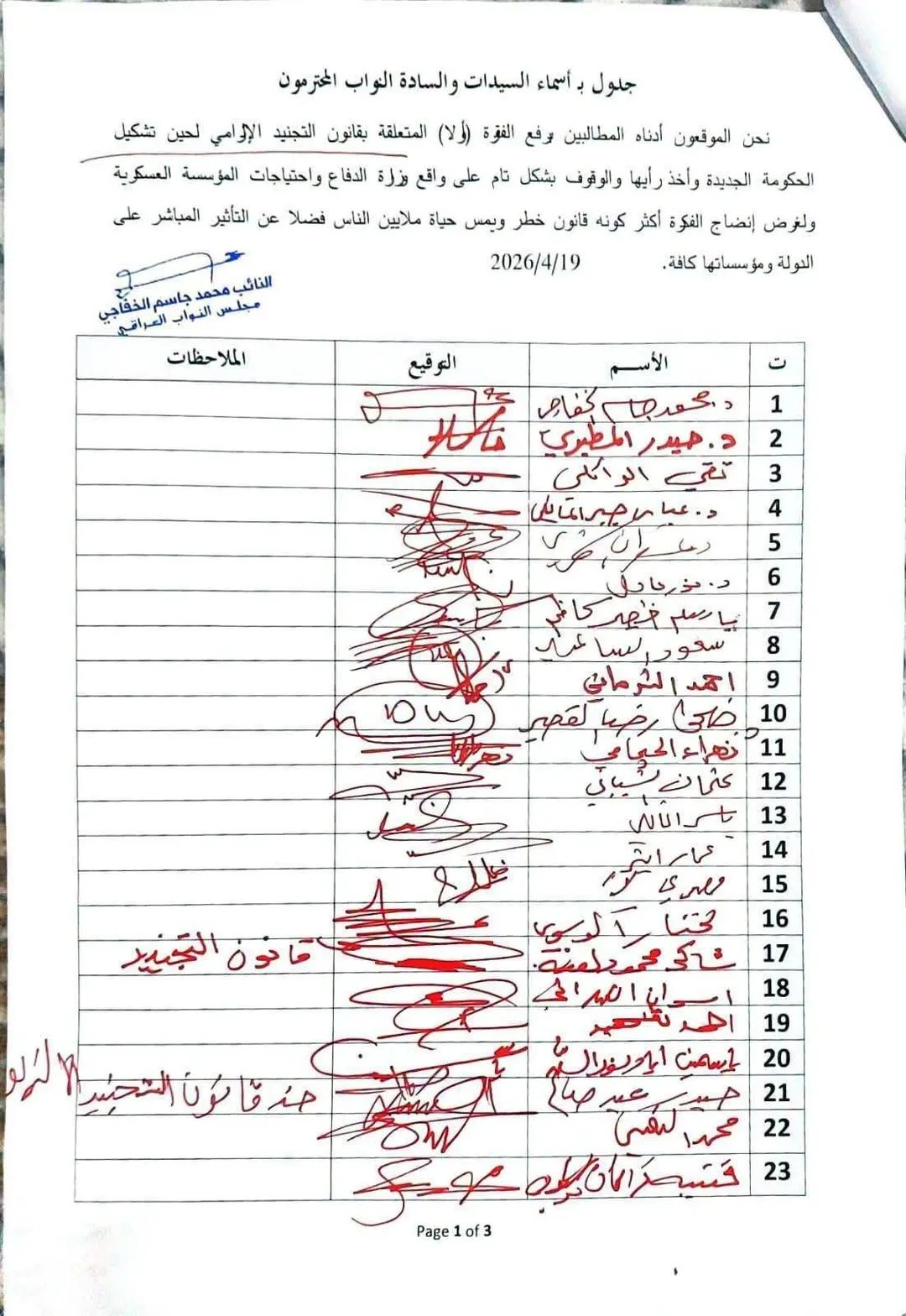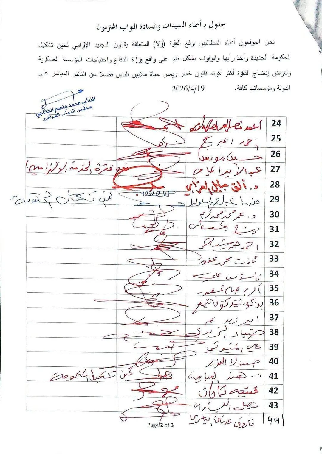 وبحسب وثائق اطلعت عليها وكالة شفق نيوز، فقد جُمعت عشرات التواقيع النيابية التي تطالب رئاسة المجلس بسحب المقترح مؤقتاً أو تأجيله إلى حين تشكيل الحكومة الجديدة، وأخذ رأيها بشأنه، فضلاً عن تقييم واقع وزارة الدفاع والاحتياجات العسكرية.
