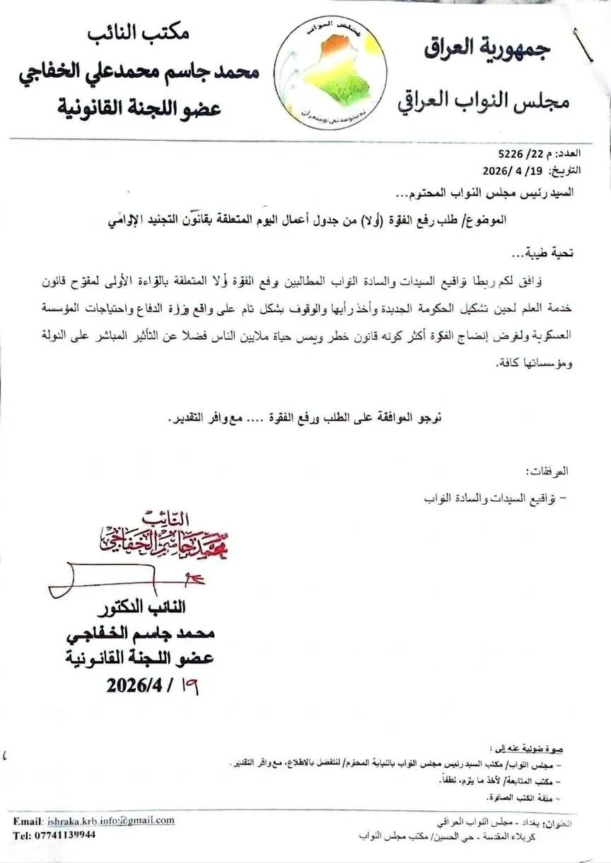 كما أعلن النائب عن كتلة حقوق، سعود الساعدي، اعتراضه على إدراج قانون خدمة العلم ضمن جدول أعمال البرلمان، معتبراً أن القانون يتضمن أعباء مالية في ظل حكومة تصريف أعمال.