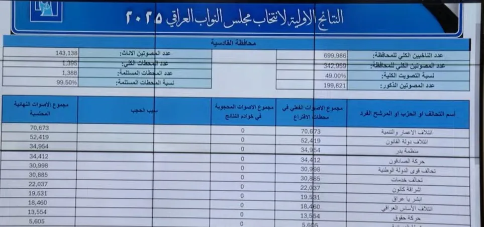 أعلنت المفوضية العليا المستقلة للانتخابات العراقية، مساء اليوم الأربعاء، النتائج الأولية للانتخابات البرلمانية للاقتراعين الخاص والعام، في محافظة الديوانية.