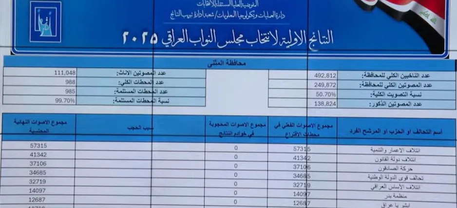 أعلنت المفوضية العليا المستقلة للانتخابات في العراق، مساء اليوم الأربعاء، تصدر ائتلاف الإعمار والتنمية بعدد الأصوات في محافظة المثنى (57315 صوتا)، فيما جاء في المرتبة الثانية ائتلاف دولة القانون (41342 صوتا)، وحركة صادقون ثالثاً (37105 صوتاً).