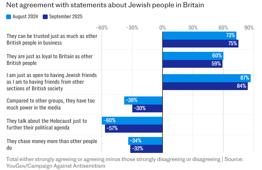 وأبرز الاستطلاع، الذي شمل عينة ممثلة من 2245 بالغاً بريطانياً وأُجري عبر الإنترنت بين 1 و2 أيلول/سبتمبر 2025، أن أكثر من واحد من كل خمسة بريطانيين (21%) يتبنى أو يتفق مع آراء تُصنف معادية للسامية، مقارنة بـ16% العام الماضي و11% في عام 2021، وهو أعلى مستوى منذ بدء رصد هذه المؤشرات قبل عقد من الزمن.