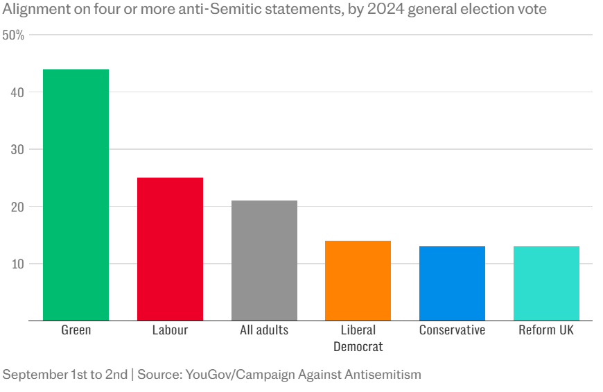 وكشف الاستطلاع الذي أُجري بالتعاون مع حملة مناهضة معاداة السامية (CAA) ونشرته صحيفة "التلغراف" البريطانية عن اختلافات واضحة بين ناخبي الأحزاب:
