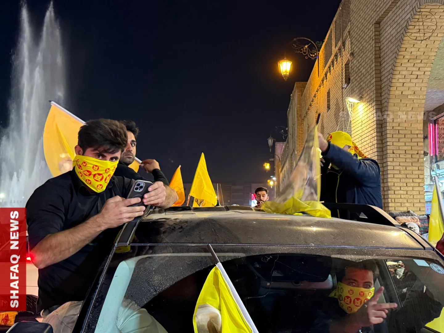 ووثقت كاميرا وكالة شفق نيوز، احتفالات أنصار الحزب في مركز أربيل قرب سوق القلعة والمعلم الحضاري للمحافظة، يستقلون سياراتهم رافعين رايات الحزب ذات اللون الأصفر وشعاره باللون الأحمر.