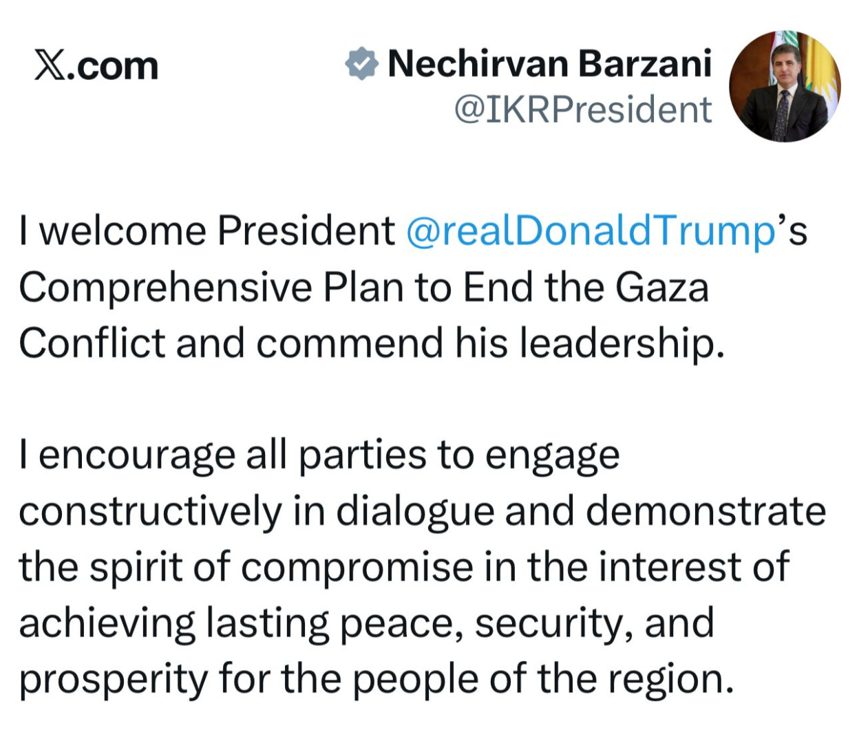 وحث الرئيس نيجيرفان بارزاني في منشور له على منصة "إكس - تويتر سابقاً"، "جميع الأطراف على الانخراط البنّاء في الحوار، والتحلي بروح التنازل، سعيًا لتحقيق السلام والأمن والازدهار الدائمين لشعوب المنطقة".