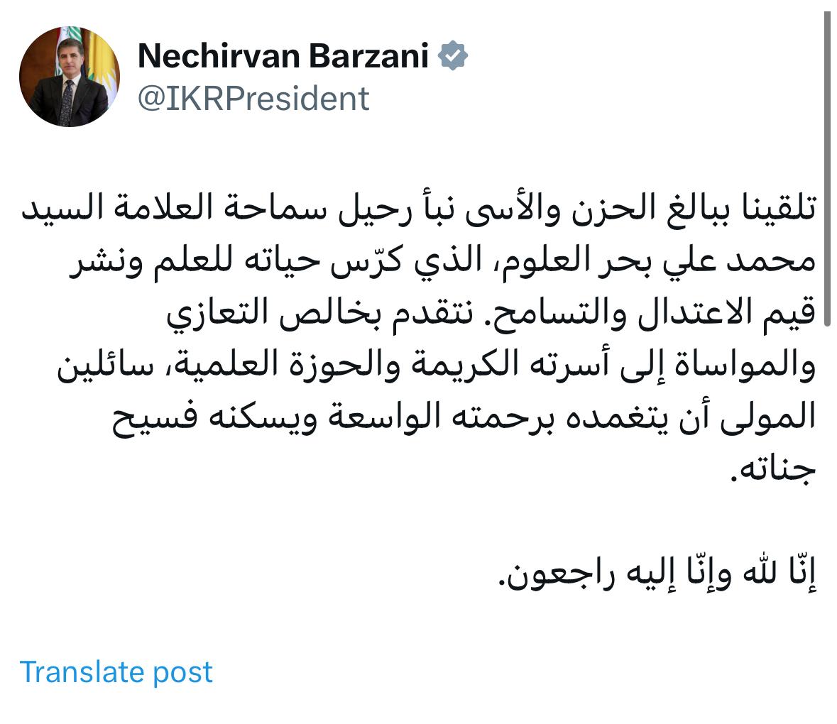 وكتب الرئيس نيجيرفان بارزاني في منشور له على منصة "إكس - تويتر سابقا"، "تلقينا ببالغ الحزن والأسى نبأ رحيل العلامة محمد علي بحر العلوم، الذي كرّس حياته للعلم ونشر قيم الاعتدال والتسامح".