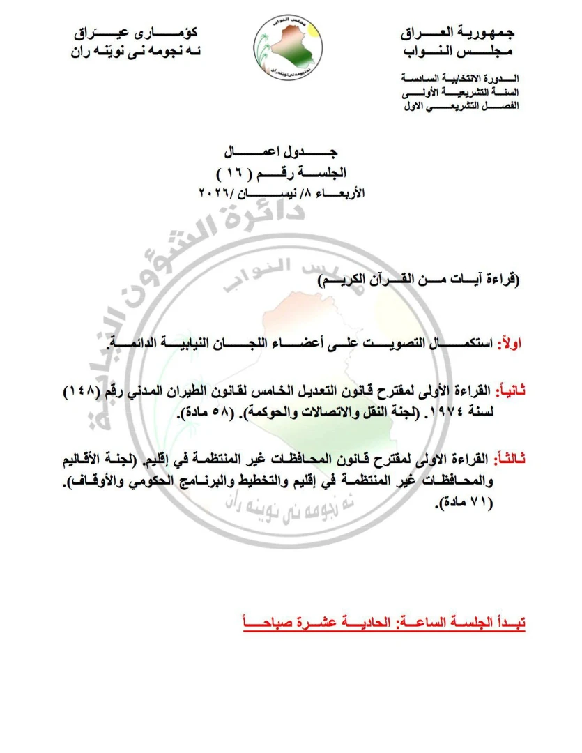 ويضم جدول الأعمال الذي اطلعت عليه شفق نيوز، على فقرتين أخريين، هما القراءة الأولى لمقترح قانون التعديل الخامس لقانون الطيران المدني، والقراءة الأولى لمقترح قانون المحافظات غير المنتظمة في إقليم.