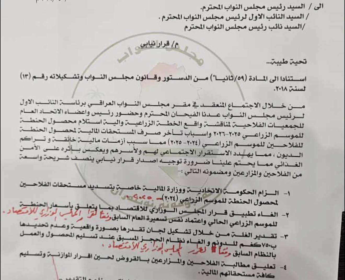 البرلمان يُلزم الحكومة بسياقات الموسم الماضي للحنطة ويبحث مستحقات الفلاحين (وثيقة)