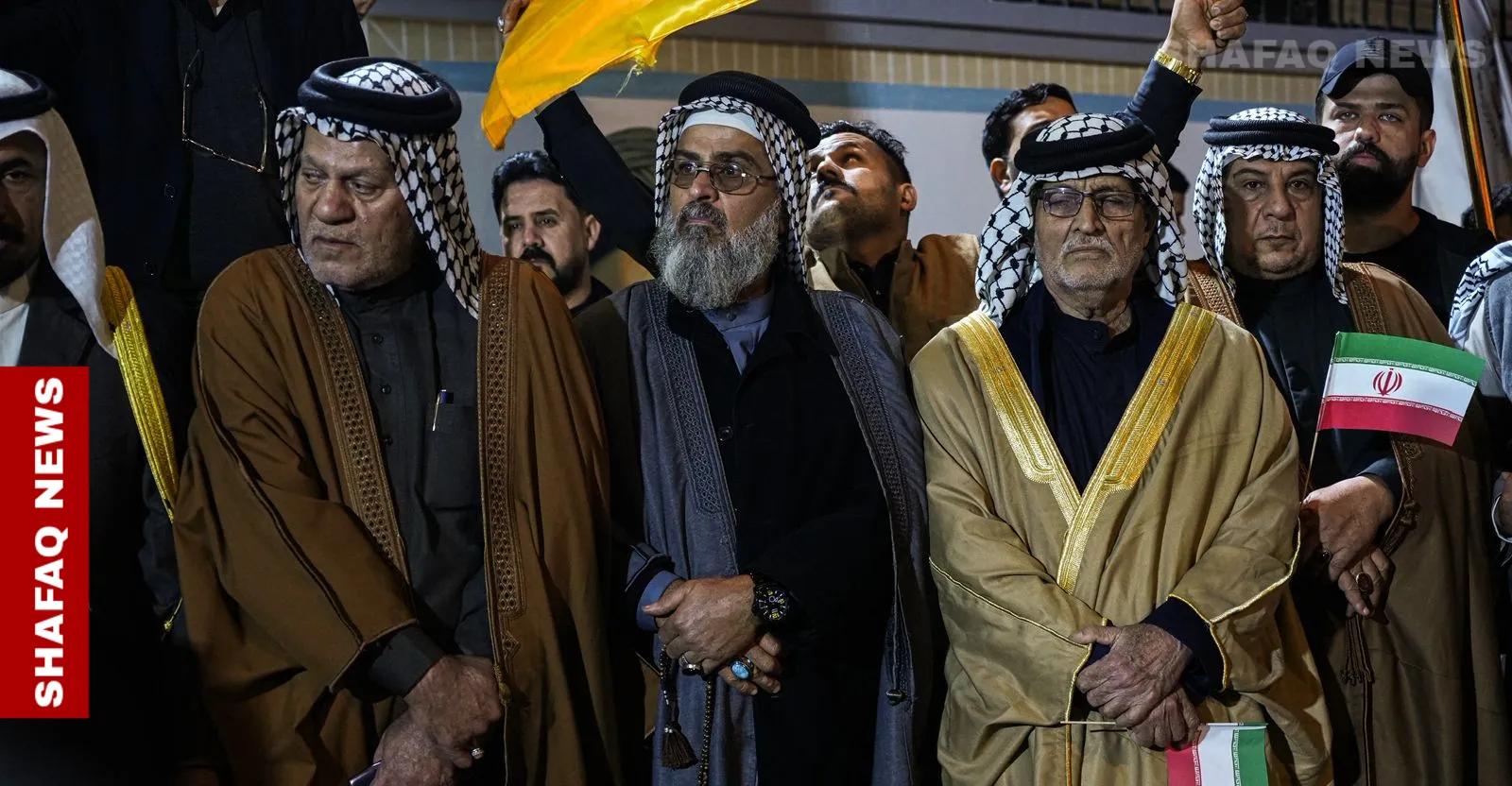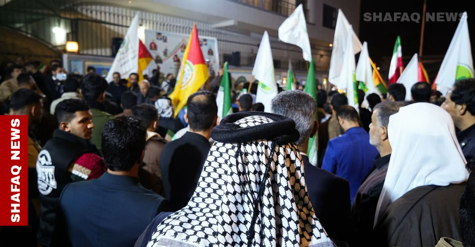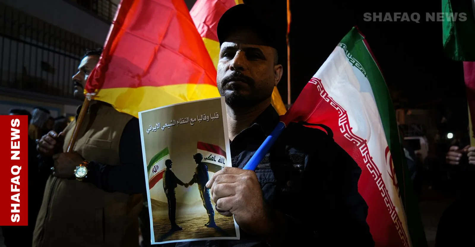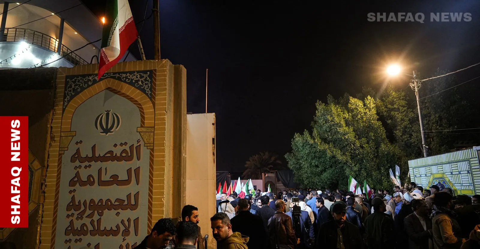 القنصلية، حاملين لافتات وشعارات مؤيدة لإيران، مع رفع أعلام إيران والحشد الشعبي.