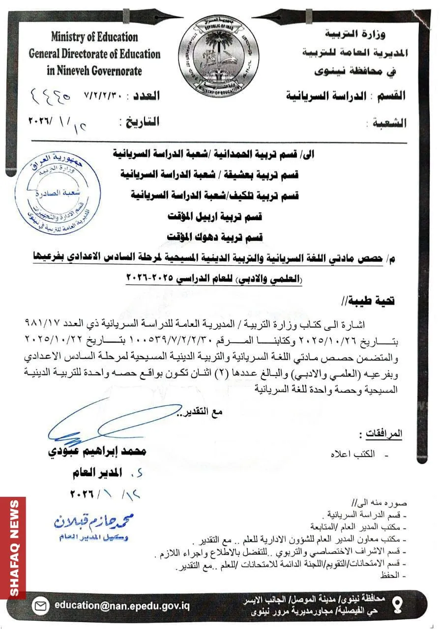 أعلنت المديرية العامة للتربية في محافظة نينوى، يوم الاثنين، تخصيص حصص دراسية لمادتي اللغة السريانية والتربية الدينية المسيحية لمرحلة السادس الاعدادي بفرعيه العلمي والأدبي للعام الدراسي 2025–2026.