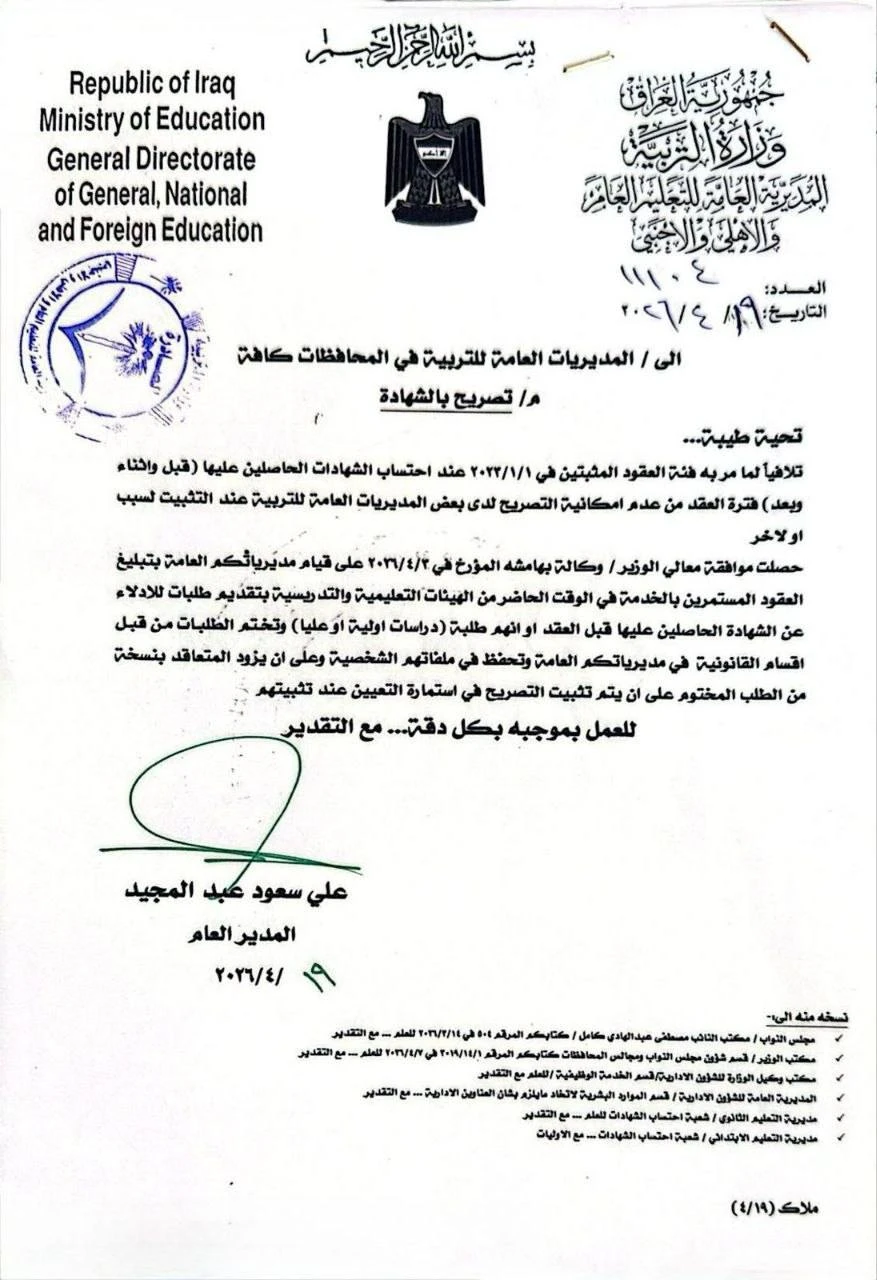 أصدر وزير التربية وكالة أحمد الأسدي، يوم الأحد، قراراً يقضي بالسماح للمتعاقدين بالتصريح بالشهادات الدراسية (الأولية والعليا) التي حصلوا عليها قبل وأثناء مدة العقد.