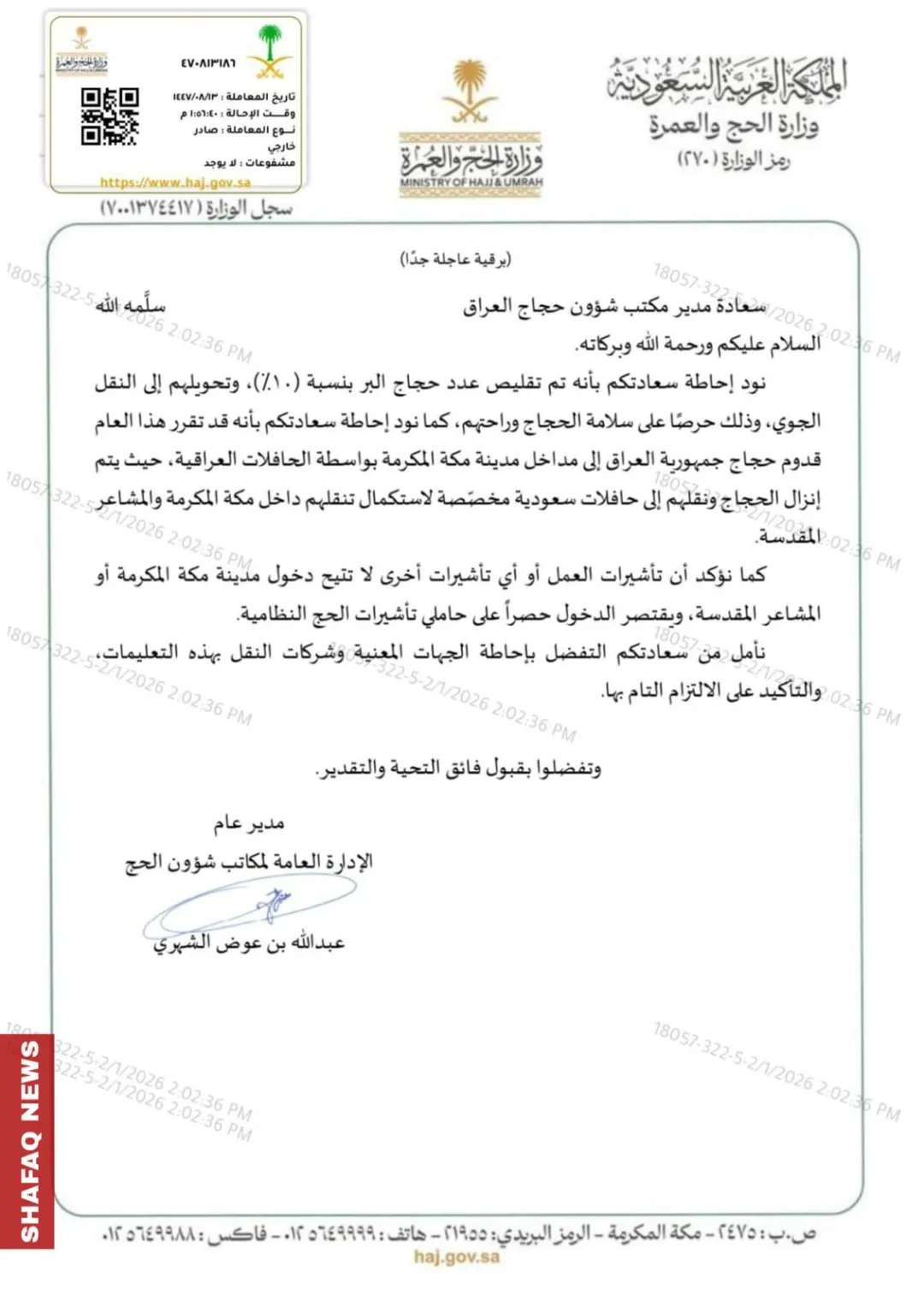 وقال كتاب صادر من مدير عام الإدارة العامة لمكاتب شؤون الحج، عبدالله بن عوض الشهري، موجّه إلى مدير مكتب شؤون حجاج العراق، ورد لوكالة شفق نيوز، إنه "تم تقليص عدد حجاج البر بنسبة (٪10)، وتحويلهم إلى النقل الجوي، وذلك حرصاً على سلامة الحجاج وراحتهم".