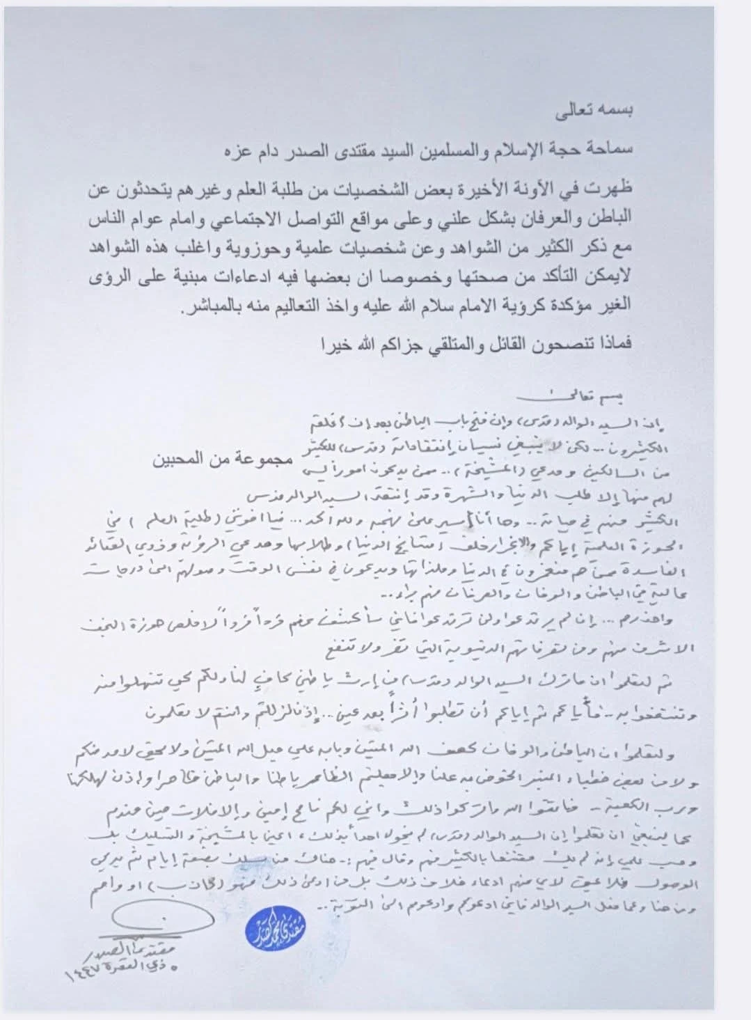 جاء ذلك في رد خطي للصدر على سؤال بشأن ظهور شخصيات من طلبة العلم وغيرهم يتحدثون علناً عن "الباطن والعرفان" عبر مواقع التواصل الاجتماعي وأمام العامة، مع طرح شواهد وادعاءات تتعلق بالرؤى و"لقاء الإمام" وأخذ التعاليم منه بصورة مباشرة.