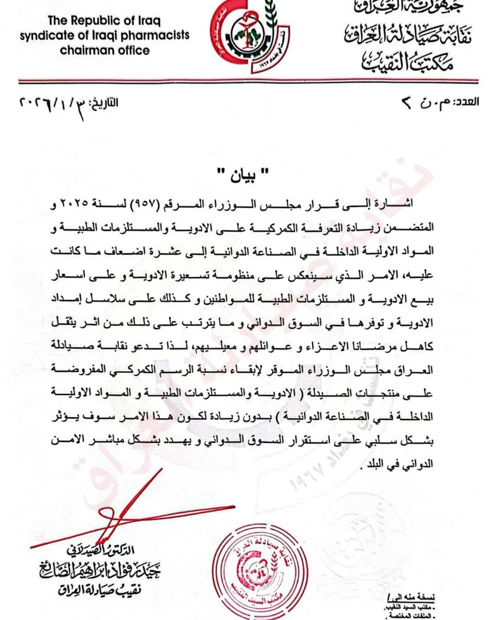 وكانت نقابة الصيادلة العراقيين قد أفادت في وقت سابق، بأن الحكومة رفعت التعرفة الجمركية على الأدوية والمستلزمات الطبية إلى 10 أضعاف، وحذرت من زيادة أسعار الادوية والمستلزمات الطبية جراء القرار الذي دعت الى التراجع عنه.