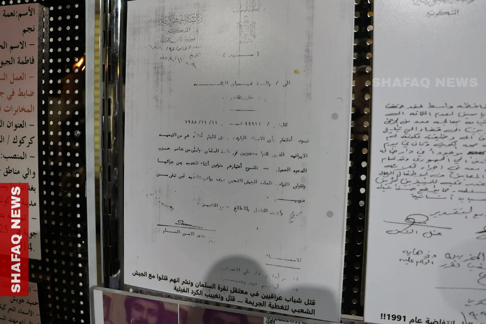 وأضاف الحاكم، لوكالة شفق نيوز أن "المعرض يتضمن عرض عدد من الوثائق المهمة، بعضها وثائق سرية رفع عنها الحظر لأول مرة، تتعلق بملفات أمنية وعمليات عسكرية مرتبطة بعمل أجهزة النظام السابق، إضافة إلى وثائق توثق جرائم وانتهاكات ارتكبت خلال تلك الحقبة".