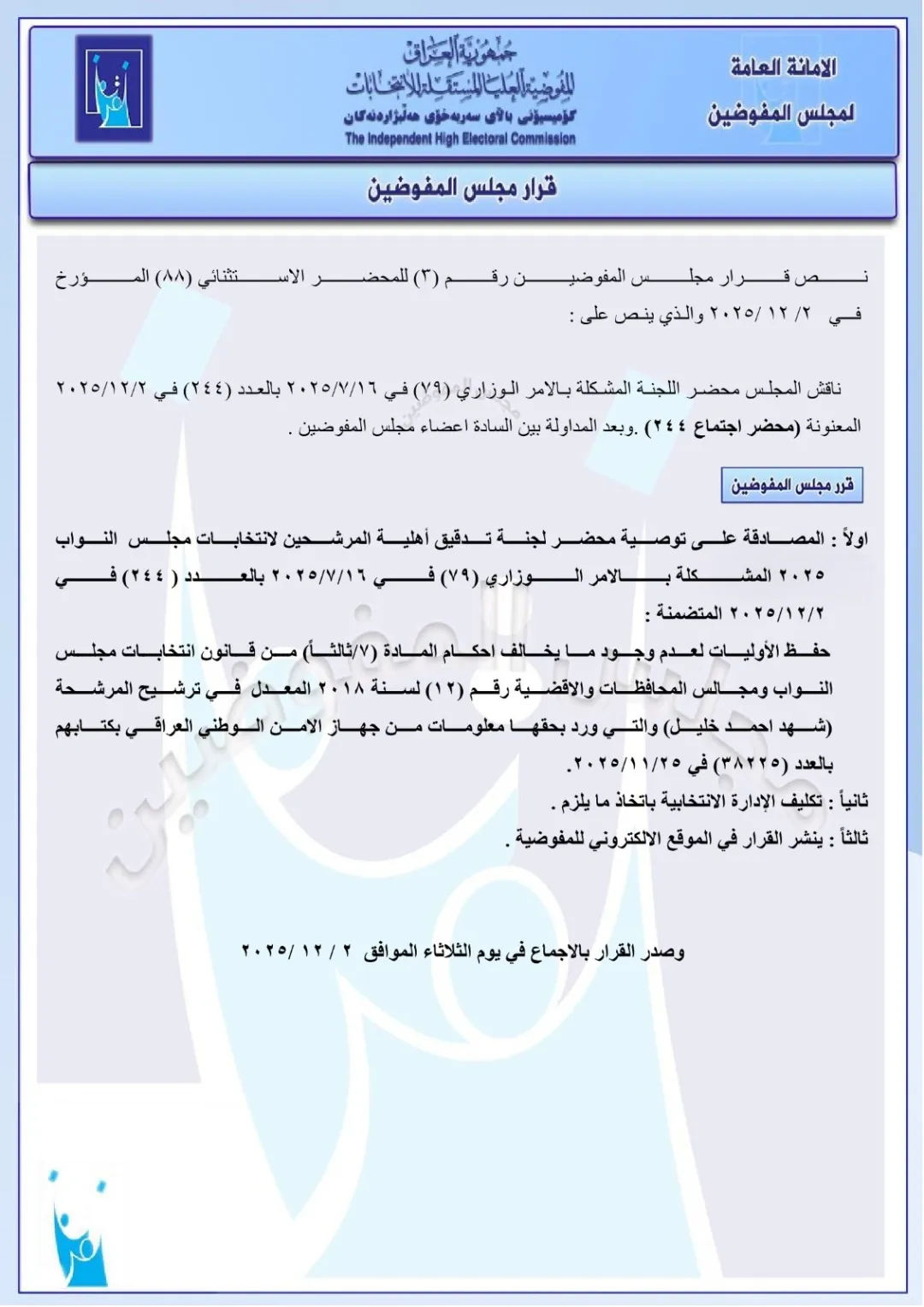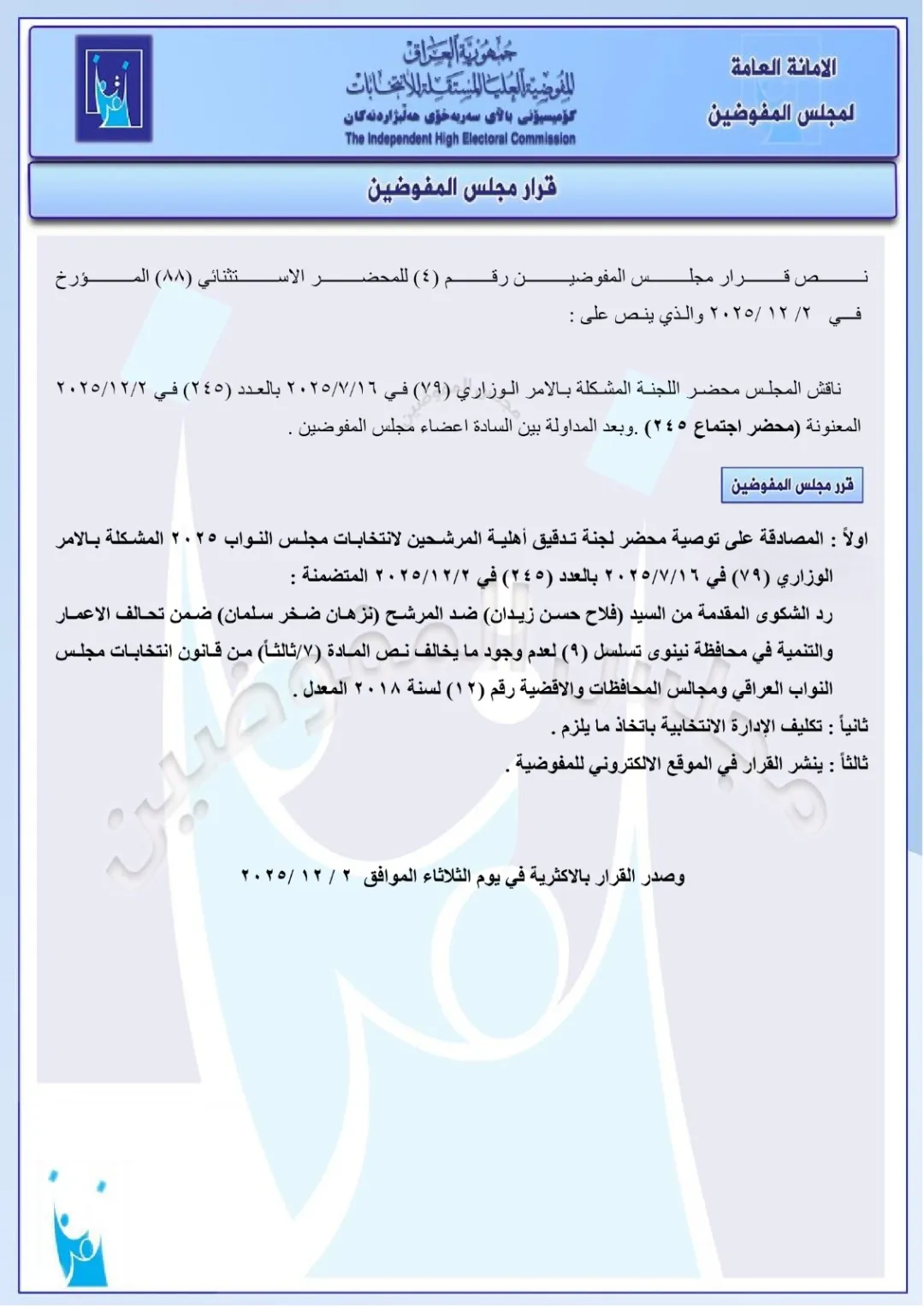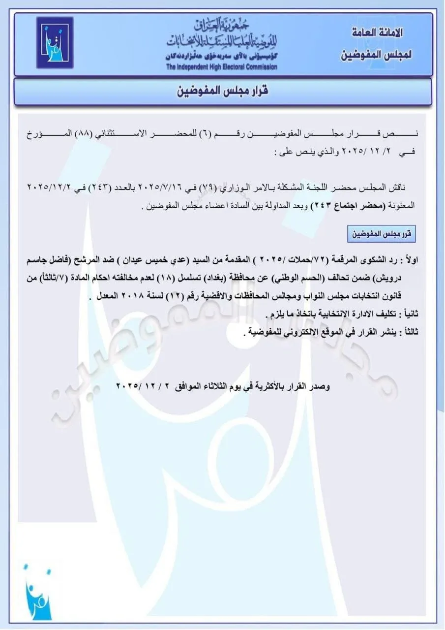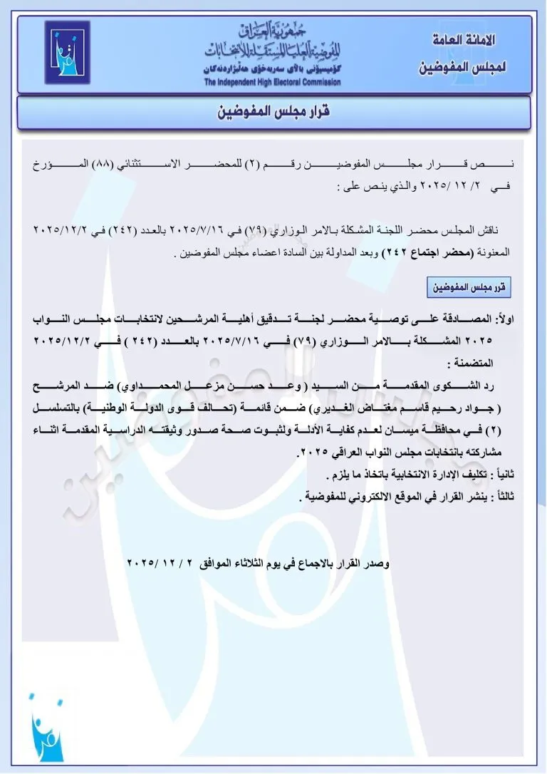 مجلس المفوضين يرد شكاوى عدد من المرشحين بشأن نتائج الانتخابات (وثائق)