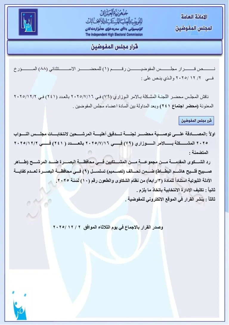 نيوز أدناه، رد عدد من الشكاوى ضد مرشحين من بغداد والبصرة وميسان، فضلاً عن حفظ