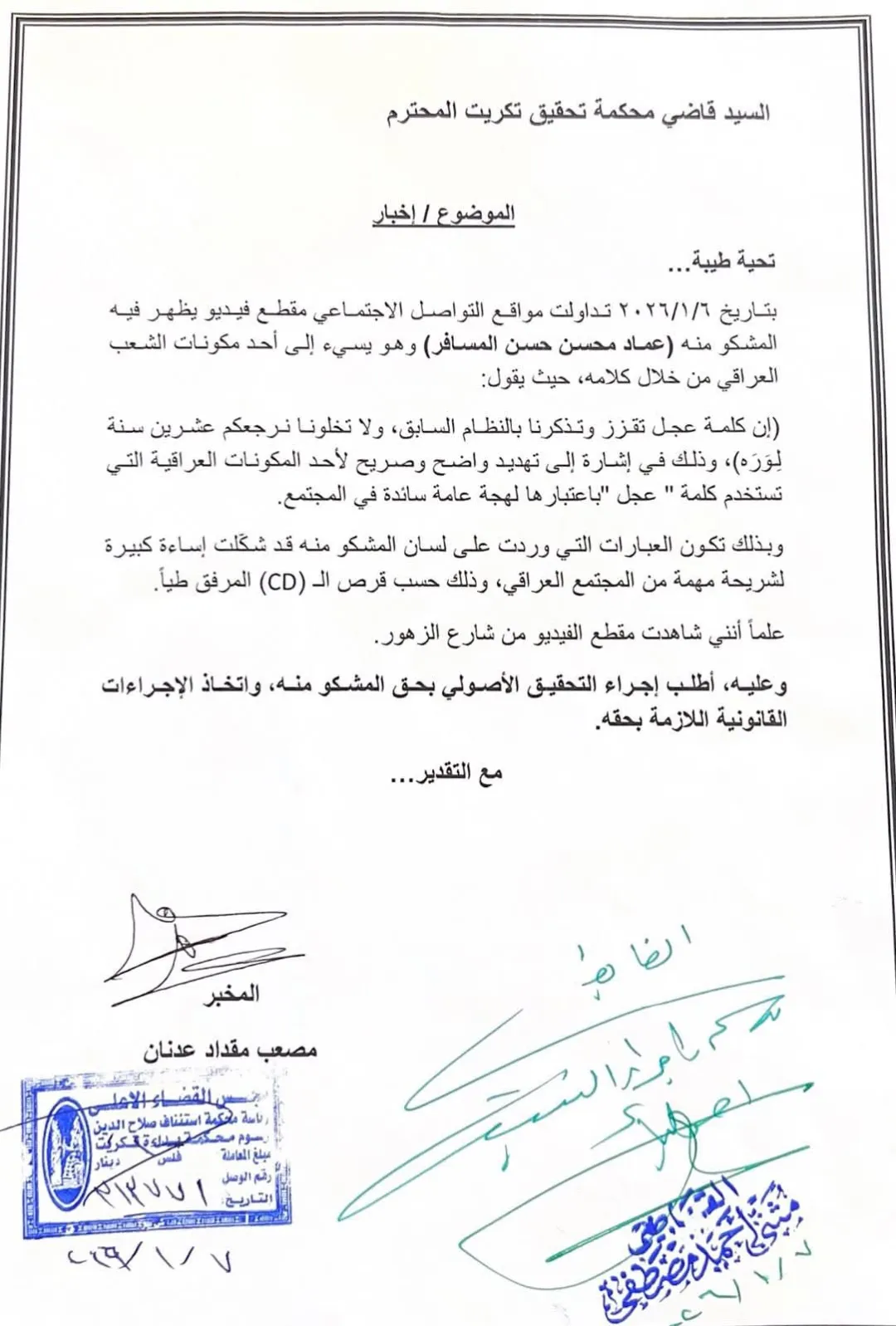 وجاء في وثيقة قدمها المحامي، مصعب مقداد، إن الاخبار يأتي بشأن مقطع فيديو جرى تداوله على مواقع التواصل الاجتماعي بتاريخ 6/1/2026، يظهر فيه المشتكى منه عماد محسن حسن المسافر، وهو يسيء إلى أحد مكونات الشعب العراقي من خلال عبارات وردت على لسانه.