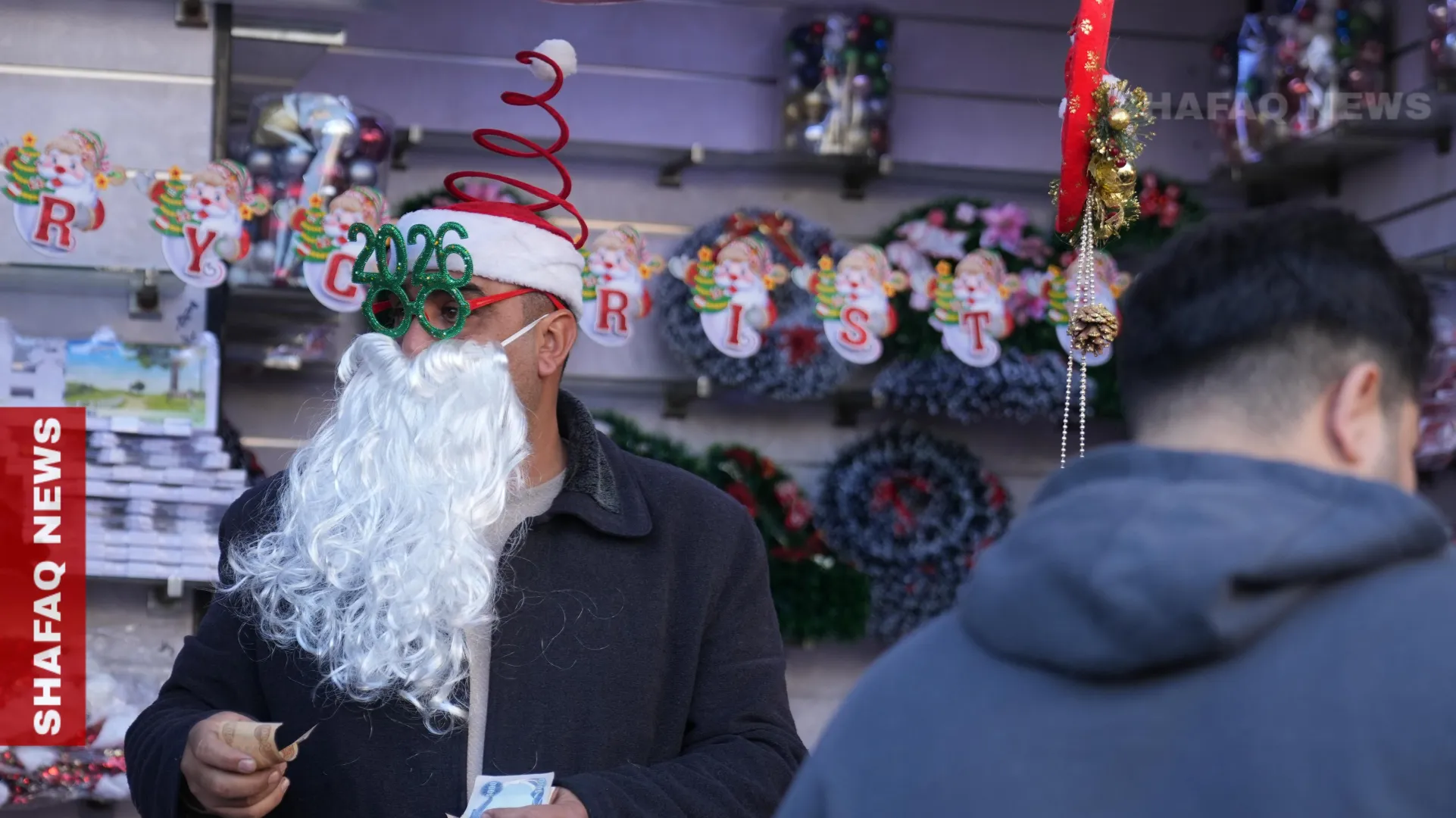 بلحية بيضاء مستعارة ونظارة خضراء يعتليها تاريخ 2026، يقف أحد باعة زينة أعياد رأس السنة الميلادية في سوق الشورجة وسط بغداد، ليستقبل زبائنه المقبلين على شراء أشجار عيد الميلاد وزينتها وملابس بابا نويل لأطفالهم، استعداداً لاستقبال السنة الجديدة.