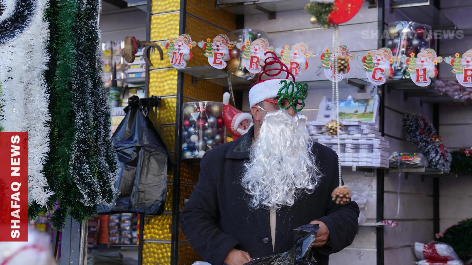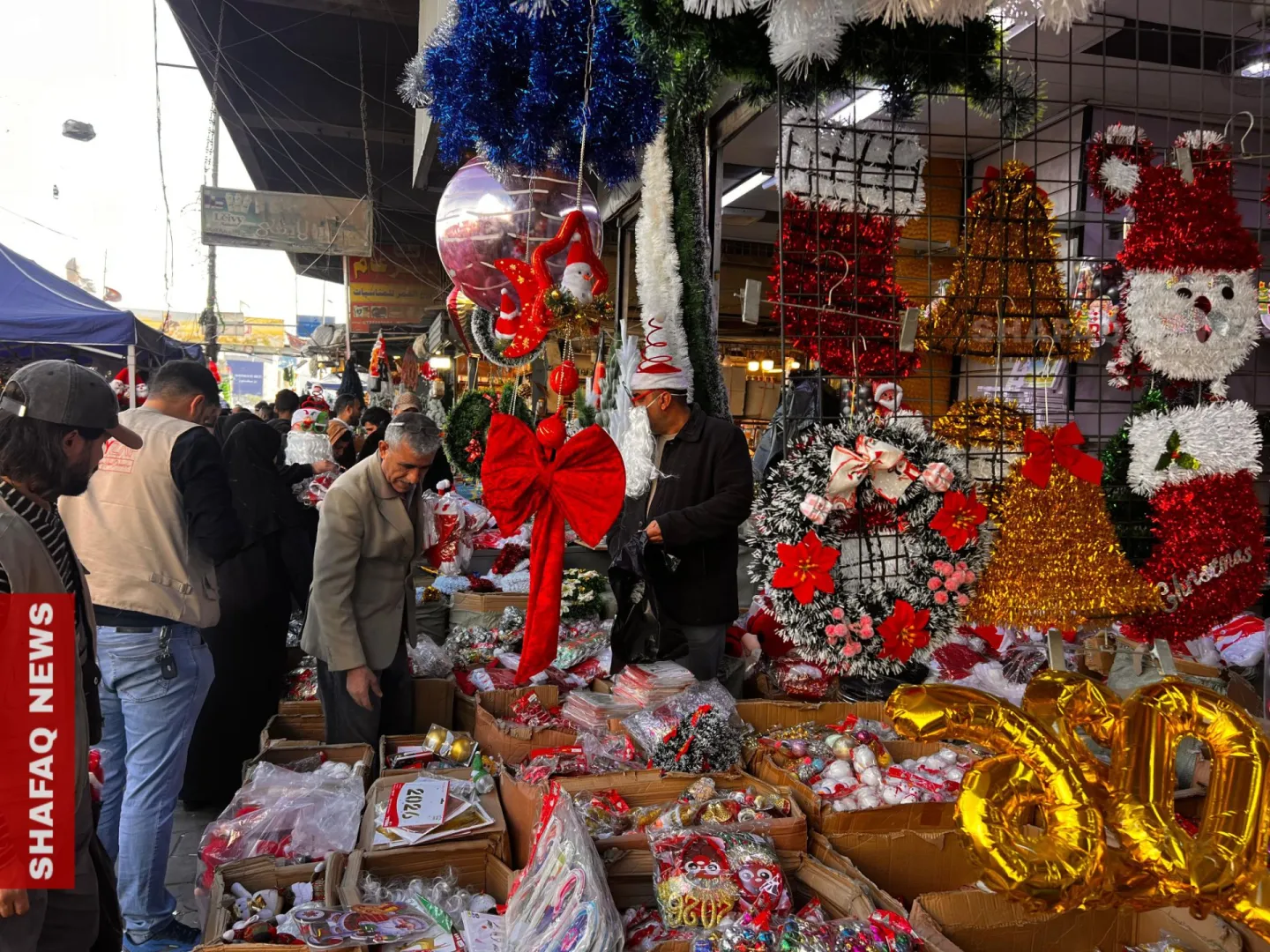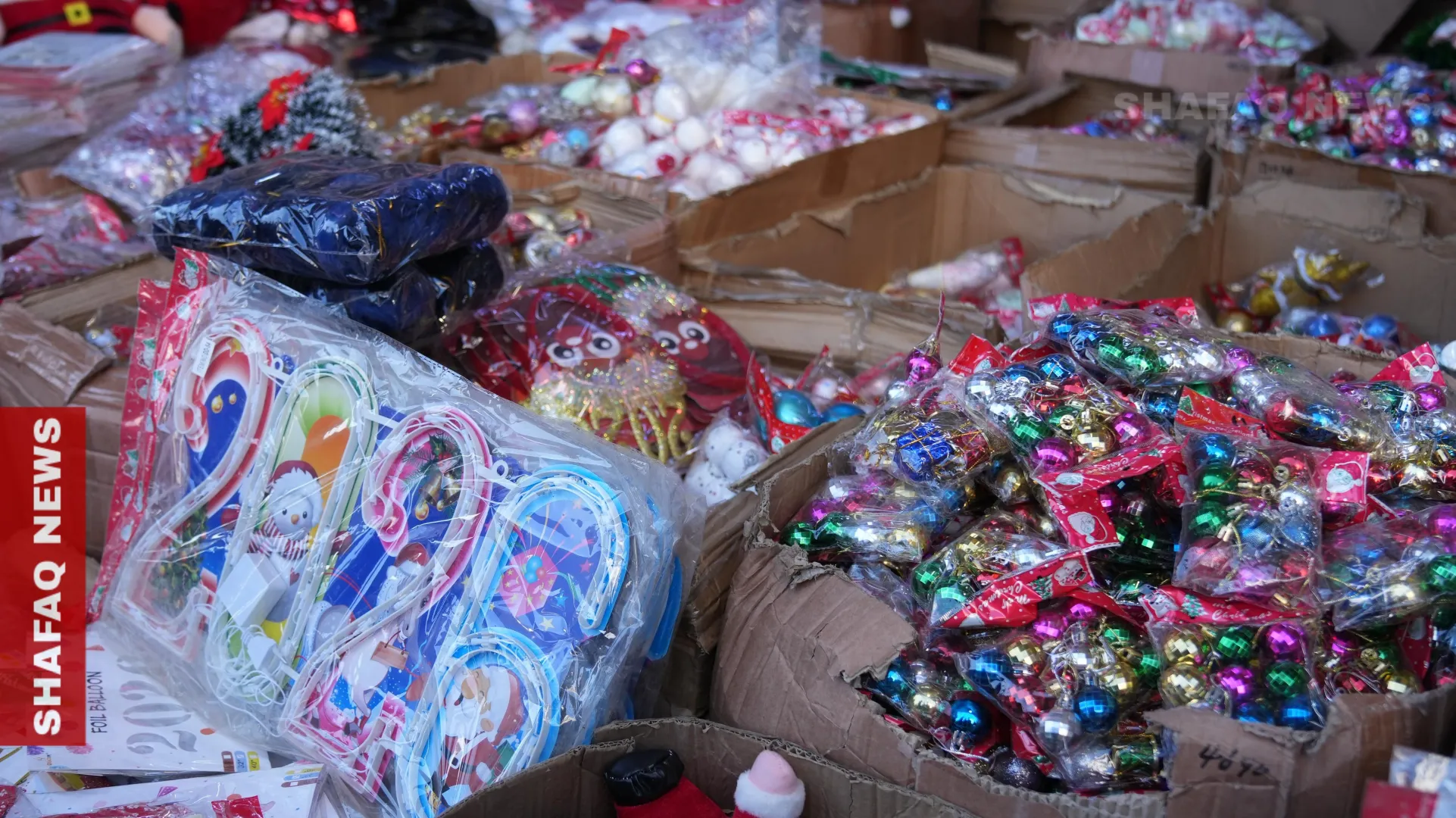 ووثقت عدسة كاميرا وكالة شفق نيوز، صوراً من سوق الشورجة حيث اكتظت واجهات المحال القريبة من شارع السوق الرئيسي بهدايا الكريسماس، وأشجار الميلاد الخضراء وزينتها اللامعة تحت الأضواء، والهدايا وملابس العيد وقبعاته التي يطغى عليها اللون الأحمر.