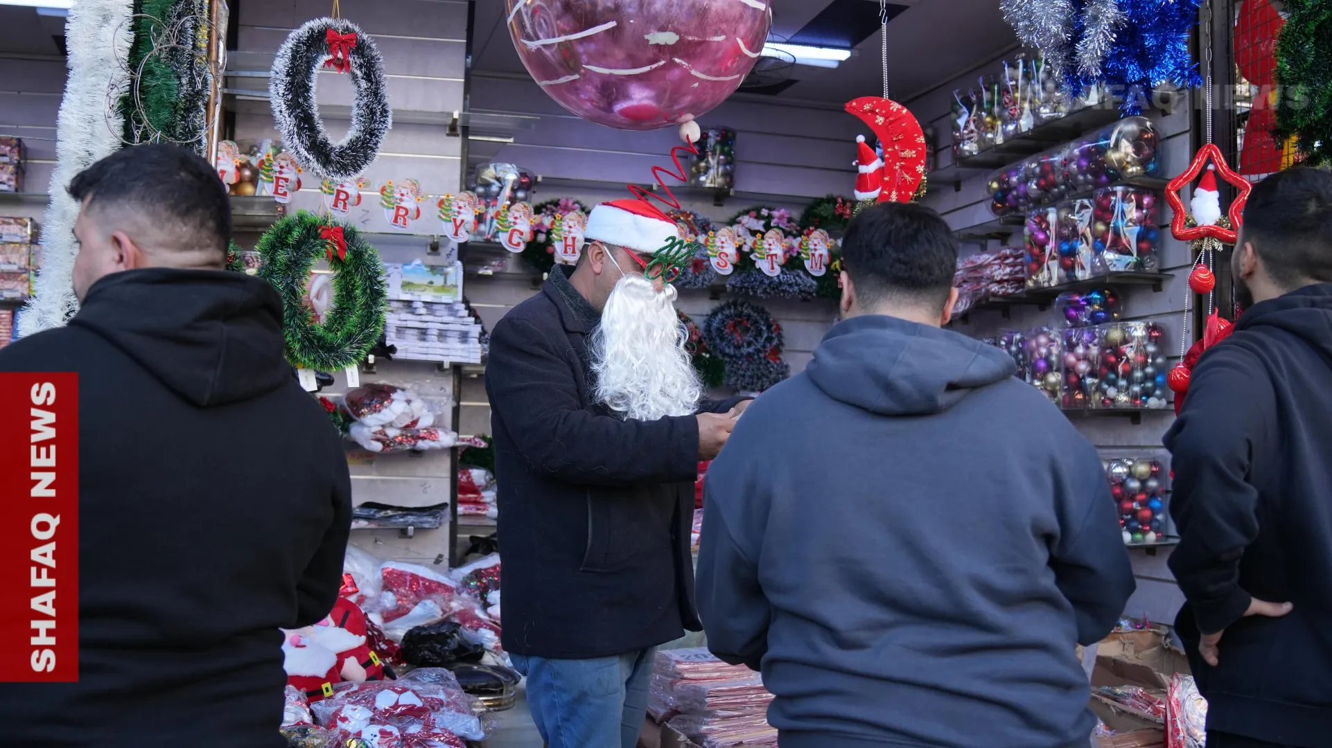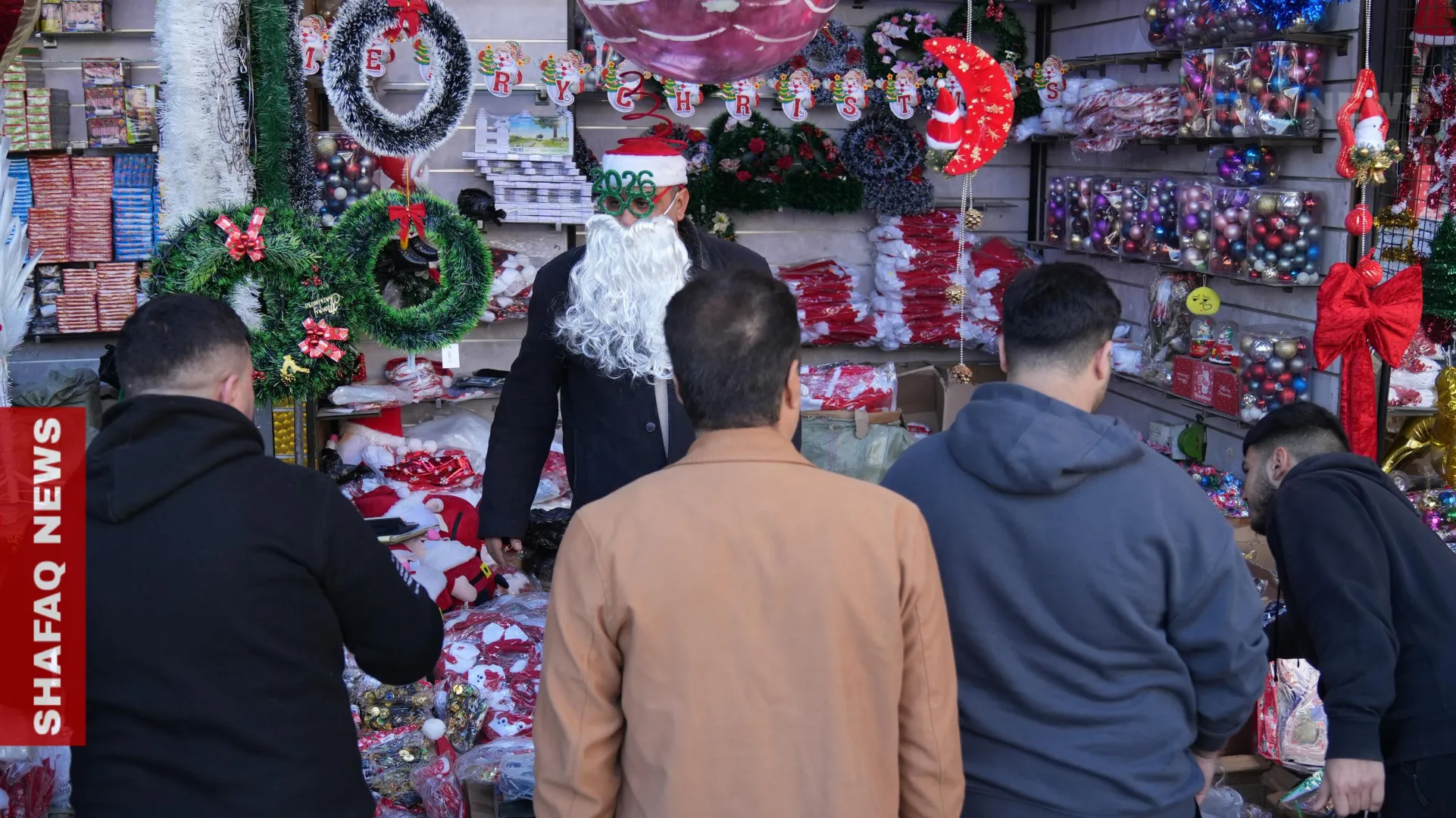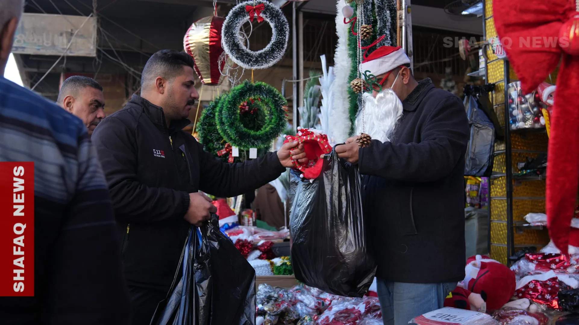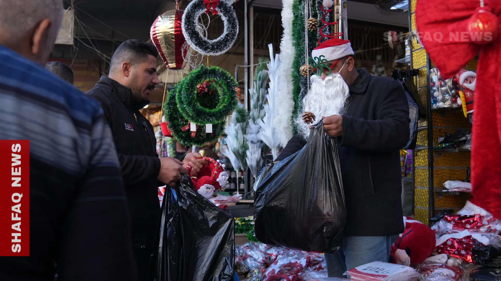ووثقت عدسة كاميرا وكالة شفق نيوز، صوراً من سوق الشورجة حيث اكتظت واجهات المحال القريبة من شارع السوق الرئيسي بهدايا الكريسماس، وأشجار الميلاد الخضراء وزينتها اللامعة تحت الأضواء، والهدايا وملابس العيد وقبعاته التي يطغى عليها اللون الأحمر.